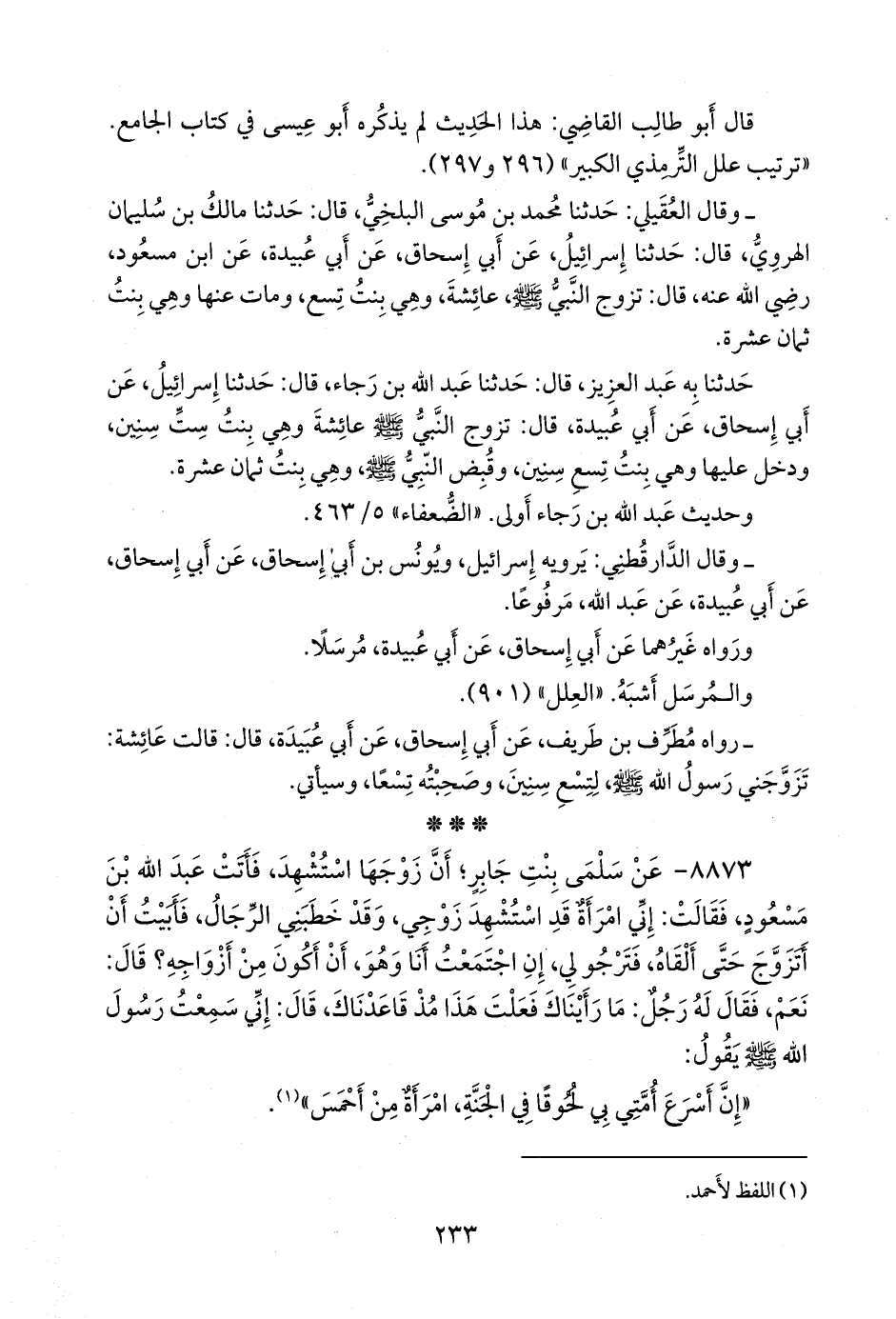 كلاهما (أحمد بن حنبل، وأَبو خيثمة زهير بن حرب) عن أبي أحمد الزُّبَيري، محمد بن عبد الله الأسدي، قال: حدثنا أَبَان بن عبد الله البَجَلي، عن كريم بن أبي حازم، عن جدته سلمى بنت جابر، فذكرته (¬٢).