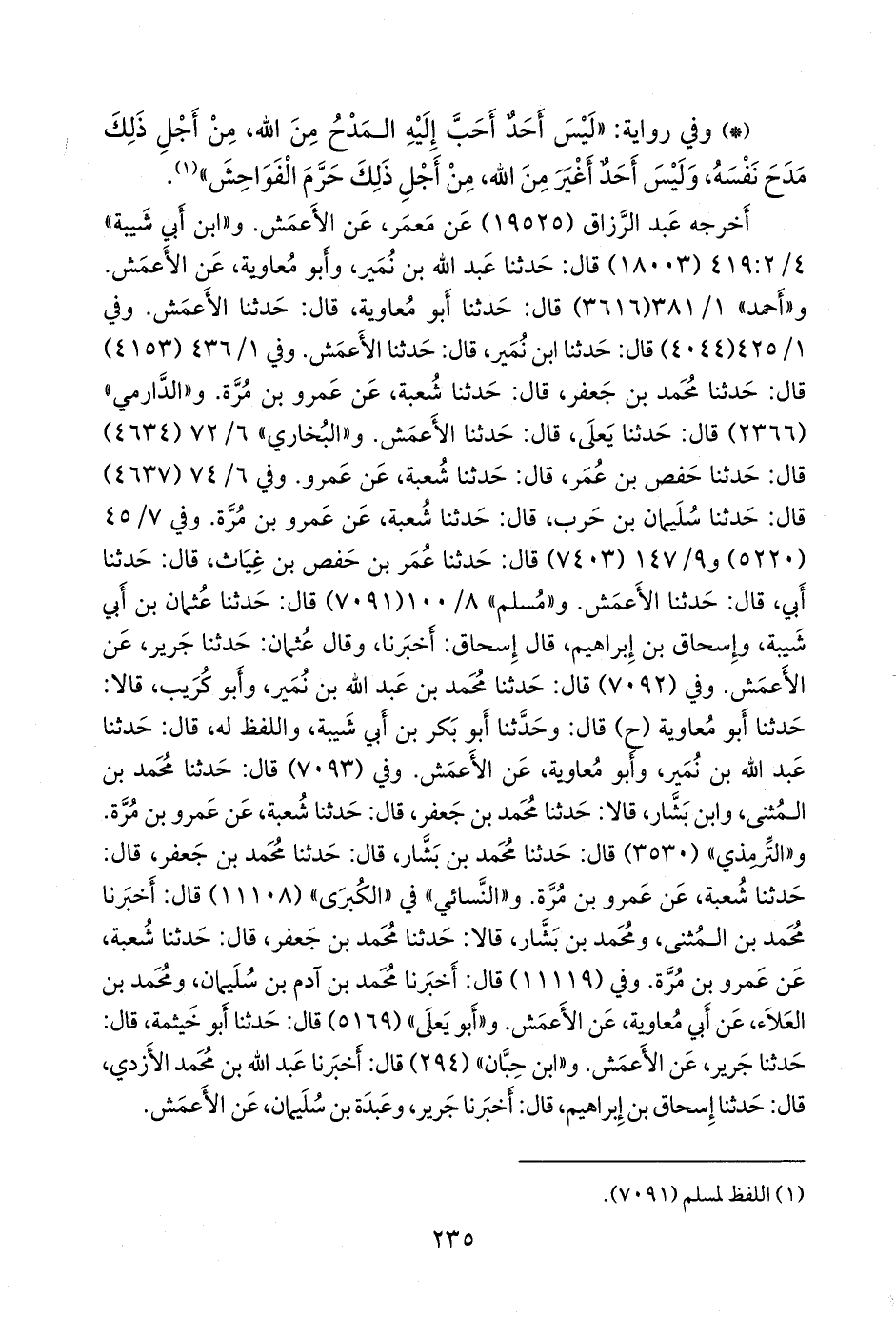 وفي ٧/ ٣٥ (٥٢٢٠) و ٩/ ١٢٠ (٧٤٠٣) قال: حدثنا عمر بن حفص بن غياث، قال: حدثنا أبي، قال: حدثنا الأعمش. و «مسلم» ٨/ ١٠٠ (٧٠٩١) قال: حدثنا عثمان بن أبي شيبة، وإسحاق بن إبراهيم، قال إسحاق: أخبرنا، وقال عثمان: حدثنا جرير، عن الأعمش. وفي (٧٠٩٢) قال: حدثنا محمد بن عبد الله بن نُمير، وأَبو كُريب، قالا: حدثنا أَبو معاوية (ح) قال: وحدثنا أَبو بكر بن أبي شيبة، واللفظ له, قال: حدثنا عبد الله بن نُمير، وأَبو معاوية، عن الأعمش. وفي (٧٠٩٣) قال: حدثنا محمد بن المثنى، وابن بشار، قالا: حدثنا محمد بن جعفر، قال: حدثنا شعبة، عن عَمرو بن مُرَّة. و «التِّرمِذي» (٣٥٣٠) قال: حدثنا محمد بن بشار، قال: حدثنا محمد بن جعفر، قال: حدثنا شعبة، عن عَمرو بن مُرَّة. و «النَّسَائي» في «الكبرى» (١١١٠٨) قال: أخبرنا محمد بن المثنى، ومحمد بن بشار، قالا: حدثنا محمد بن جعفر، قال: حدثنا شعبة، عن عَمرو بن مُرَّة. وفي (١١١١٩) قال: أخبرنا محمد بن آدم بن سليمان، ومحمد بن العلاء، عن أبي معاوية، عن الأعمش. و «أَبو يَعلى» (٥١٦٩) قال: حدثنا أَبو خيثمة، قال: حدثنا جرير، عن الأعمش. و «ابن حِبَّان» (٢٩٤) قال: أخبرنا عبد الله بن محمد الأزدي، قال: حدثنا إسحاق بن إبراهيم، قال: أخبرنا جرير، وعَبدة بن سليمان، عن الأعمش.
