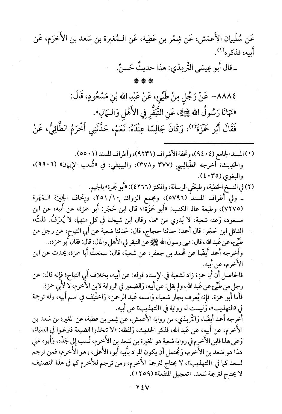 (¬١) في النسخ الخطية، وطبعتي الرسالة، والمكنز (٤٢٦٦): «أَبو جمرة» بالجيم، وفي أطراف المسند (٥٧٩٦)، ومَجمَع الزوائد ١٠/ ٢٥١، وإتحاف الخِيرَة المَهَرة (٧٢٧٥)، وطبعة عالم الكتب: «أَبو حمزة»، قال ابن حجر: أَبو حمزة، عن أبيه، عن ابن مسعود، وعنه شعبة، لا يُدرى من هما، وقال ابن شيخنا في كل منهما، لا يعرف، قلت، القائل ابن حجر: قال أحمد: حدثنا حجاج، قال: حدثنا شعبة عن أبي التياح، عن رجل من طيئ، عن عبد الله، قال: نهى رسول الله صَلى الله عَليه وسَلم عن التبقر في الأهل والمال، قال: فقال أَبو حمزة، وأخرجه أحمد أيضا عن محمد بن جعفر، عن شعبة، قال: سمعت أبا حمزة، يحدث عن أبي الأخرم، عن أبيه، فالحاصل أن أبا حمزة زاد لشعبة في الإسناد قوله: عن أبيه، بخلاف أبي التياح؛ فإنه قال: عن رجل من طيئ عن عبد الله، ولم يقل: عن أبيه، والضمير في الرواية لابن الأخرم، لا لأبي حمزة، فأما أَبو حمزة، فإنه يعرف بجار شعبة، واسمه عبد الرَّحمَن، واختلف في اسم أبيه، وله ترجمة في «التهذيب»، وليست له رواية في «التهذيب» عن أبيه، أخرجه أحمد أيضا، والتِّرمِذي، من رواية الأعمش، عن شمر بن عطية، عن المغيرة بن سعد بن الأخرم، عن أبيه، عن عبد الله، فذكر الحديث، ولفظه: «لا تتخذوا الضيعة فترغبوا في الدنيا»، وعلى هذا فابن الأخرم في رواية شعبة هو المغيرة بن سعد بن الأخرم، نسب إلى جده، وأَبوه على هذا هو سعد بن الأخرم، ويحتمل أن يكون المراد بأبيه أَبوه الأعلى، وهو الأخرم، فمن ترجم لسعد كما في «التهذيب»، لا يحتاج لترجمة الأخرم، ومن ترجم للأخرم كما في هذا التصنيف لا يحتاج لترجمة سعد. «تعجيل المنفعة» (١٢٥٩).