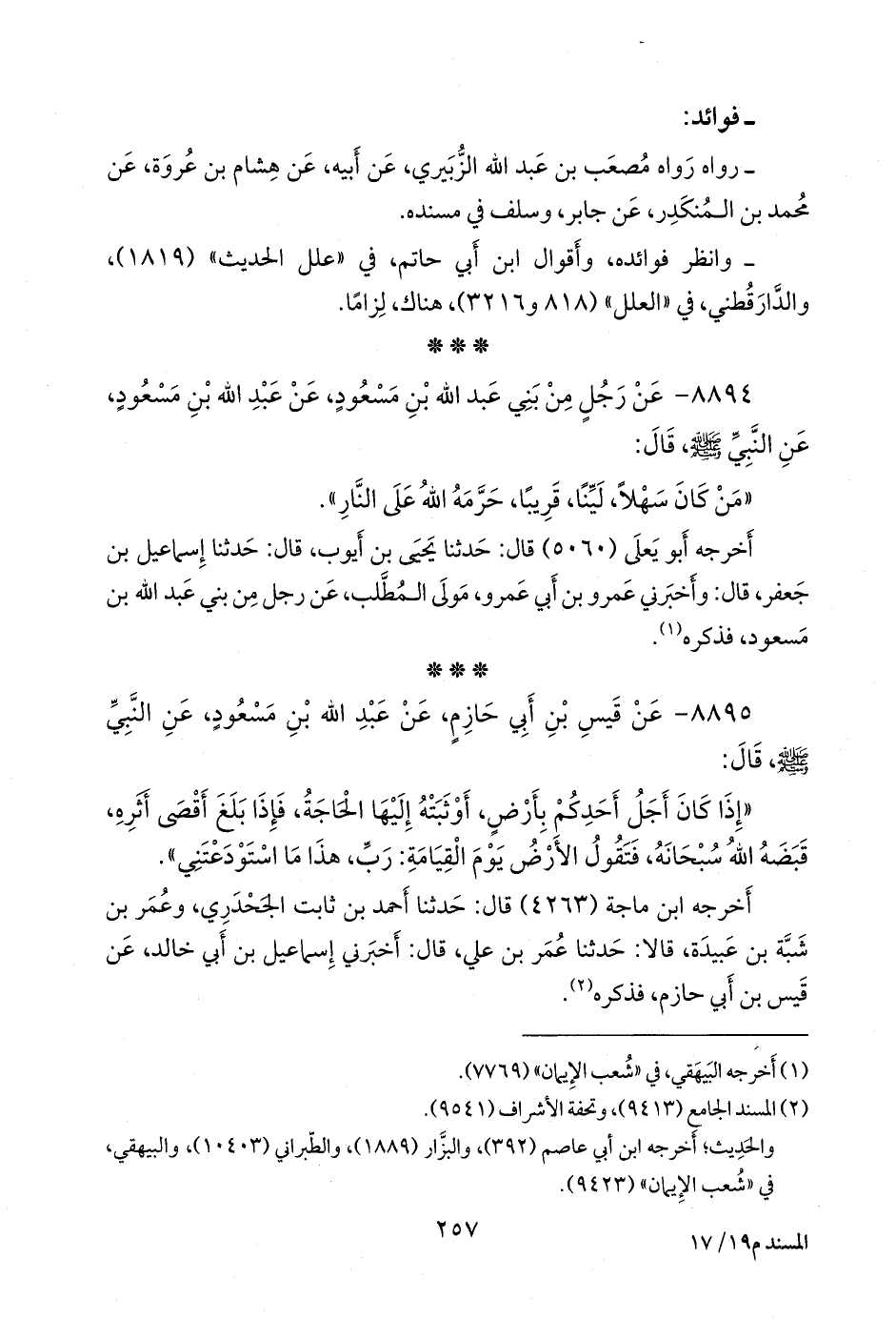 ٨٨٩٥ - عن قيس بن أبي حازم، عن عبد الله بن مسعود، عن النبي صَلى الله عَليه وسَلم قال: