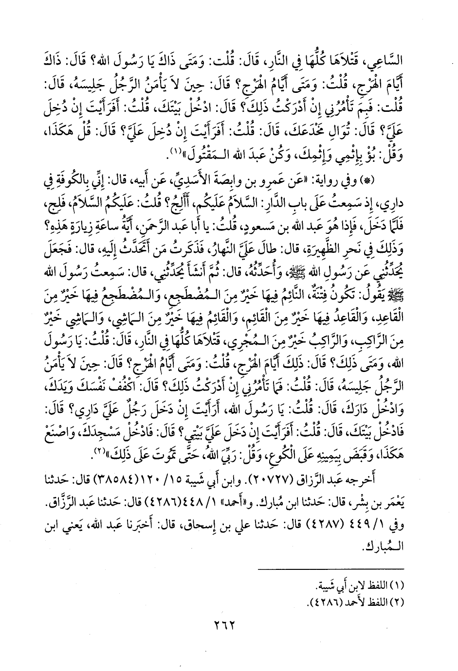 - وفي رواية: «عن عَمرو بن وابصة الأسدي، عن أبيه، قال: إني بالكوفة في داري، إذ سمعت على باب الدار: السلام عليكم، أألج؟ قلت: عليكم السلام، فلج، فلما دخل، فإذا هو عبد الله بن مسعود، قلت: يا أبا عبد الرَّحمَن، أية ساعة زيارة هذه؟ وذلك في نحر الظهيرة، قال: طال علي النهار، فذكرت من أتحدث إليه، قال: فجعل يحدثني عن رسول الله صَلى الله عَليه وسَلم وأحدثه، قال: ثم أنشأ يحدثني، قال: سمعت رسول الله صَلى الله عَليه وسَلم يقول: تكون فتنة، النائم فيها خير من المضطجع، والمضطجع فيها خير من القاعد، والقاعد فيها خير من القائم، والقائم فيها خير من الماشي، والماشي خير من الراكب، والراكب خير من المجري، قتلاها كلها في النار، قال: قلت: يا رسول الله، ومتى ذلك؟ قال: ذلك أيام الهرج، قلت: ومتى أيام الهرج؟ قال: حين لا يأمن الرجل جليسه، قال: قلت: فما تأمرني إن أدركت ذلك؟ قال: اكفف نفسك ويدك، وادخل دارك، قال: قلت: يا رسول الله، أرأيت إن دخل رجل علي داري؟ قال: فادخل بيتك، قال: قلت: أفرأيت إن دخل علي بيتي؟ قال: فادخل مسجدك، واصنع هكذا، وقبض بيمينه على الكوع، وقل: ربي الله، حتى تموت على ذلك» (¬١).