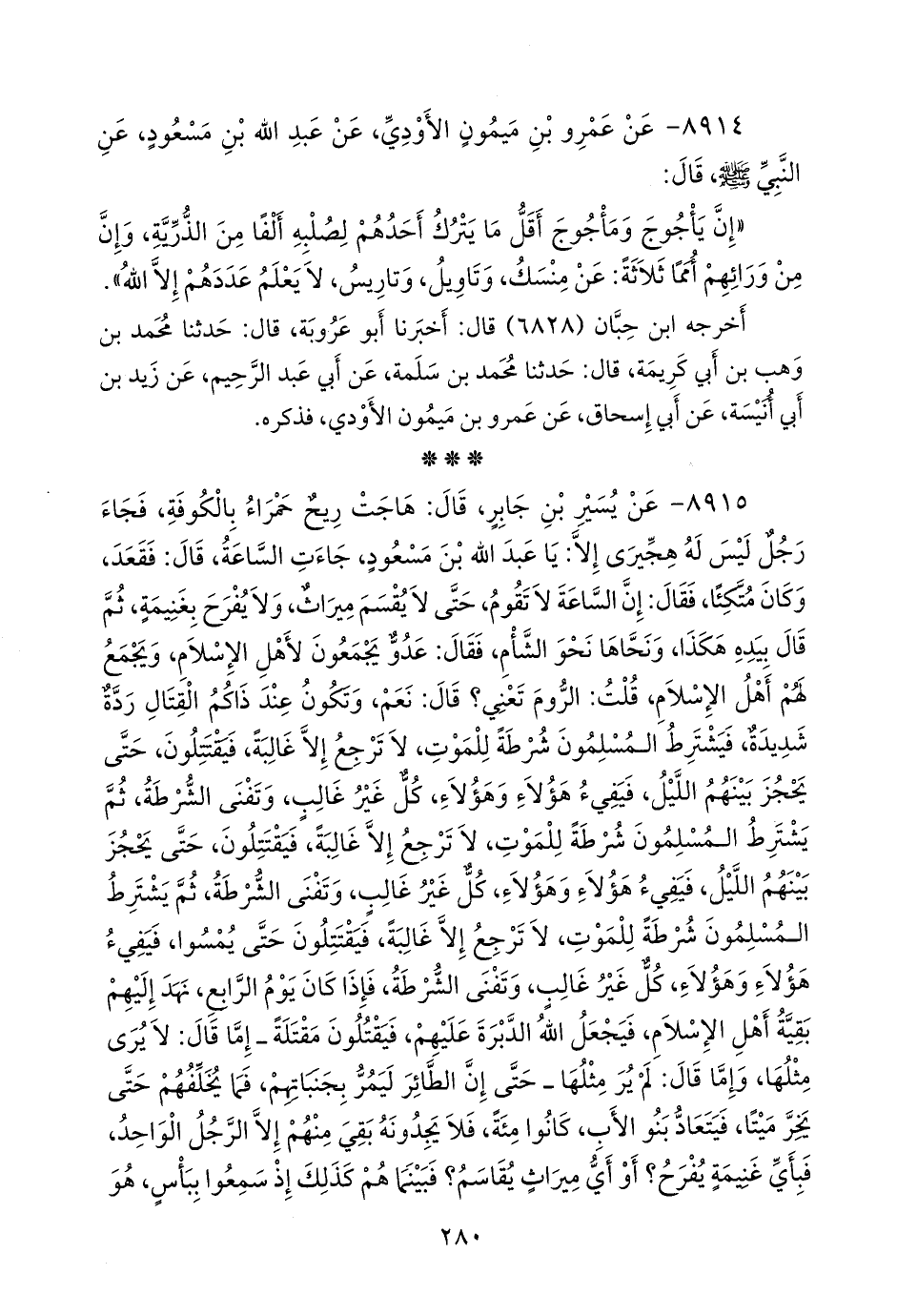 ٨٩١٥ - عن يسير بن جابر، قال: هاجت ريح حمراء بالكوفة، فجاء رجل ليس له هجيرى إلا: يا عبد الله بن مسعود، جاءت الساعة، قال: فقعد، وكان متكئا، فقال: إن الساعة لا تقوم، حتى لا يقسم ميراث، ولا يفرح بغنيمة، ثم قال بيده هكذا، ونحاها نحو الشأم، فقال: عدو يجمعون لأهل الإسلام، ويجمع لهم أهل الإسلام، قلت: الروم تعني؟ قال: نعم، وتكون عند ذاكم القتال ردة شديدة، فيشترط المسلمون شرطة للموت، لا ترجع إلا غالبة، فيقتتلون، حتى يحجز بينهم الليل، فيفيء هؤلاء وهؤلاء، كل غير غالب، وتفنى الشرطة، ثم يشترط المسلمون شرطة للموت، لا ترجع إلا غالبة، فيقتتلون، حتى يحجز بينهم الليل، فيفيء هؤلاء وهؤلاء، كل غير غالب، وتفنى الشرطة، ثم يشترط المسلمون شرطة للموت، لا ترجع إلا غالبة، فيقتتلون حتى يمسوا، فيفيء هؤلاء وهؤلاء، كل غير غالب، وتفنى الشرطة، فإذا كان يوم الرابع، نهد إليهم بقية أهل الإسلام، فيجعل الله الدبرة عليهم, فيقتلون مقتلة ـ إما قال: لا يرى مثلها، وإما قال: لم ير مثلها ـ حتى إن الطائر ليمر بجنباتهم، فما يخلفهم حتى يخر ميتا، فيتعاد بنو الأب، كانوا مئة، فلا يجدونه بقي منهم إلا الرجل الواحد، فبأي غنيمة يفرح؟ أو أي ميراث يقاسم؟ فبينما هم كذلك إذ سمعوا ببأس، هو