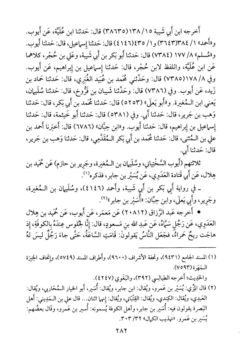 و «مسلم» ٨/ ١٧٧ (٧٣٨٤) قال: حدثنا أَبو بكر بن أبي شيبة، وعلي بن حُجْر، كلاهما عن ابن عُلَية، واللفظ لابن حُجْر، قال: حدثنا إسماعيل بن إبراهيم، عن أيوب. وفي ٨/ ١٧٨ (٧٣٨٥) قال: وحدثني محمد بن عُبيد الغبري، قال: حدثنا حماد بن زيد، عن أيوب. وفي (٧٣٨٦) قال: وحدثنا شَيبان بن فَرُّوخ، قال: حدثنا سليمان، يعني ابن المغيرة. و «أَبو يَعلى» (٥٢٥٣) قال: حدثنا محمد بن أَبي بكر، قال: حدثنا وهب بن جرير، قال: حدثنا أبي. وفي (٥٣٨١) قال: حدثنا أَبو خيثمة، قال: حدثنا إسماعيل بن إبراهيم، قال: حدثنا أيوب. و «ابن حِبَّان» (٦٧٨٦) قال: أخبرنا أحمد بن علي بن المثنى، قال: حدثنا محمد بن أَبي بكر المُقَدَّمي، قال: حدثنا وهب بن جرير، قال: حدثنا أبي.