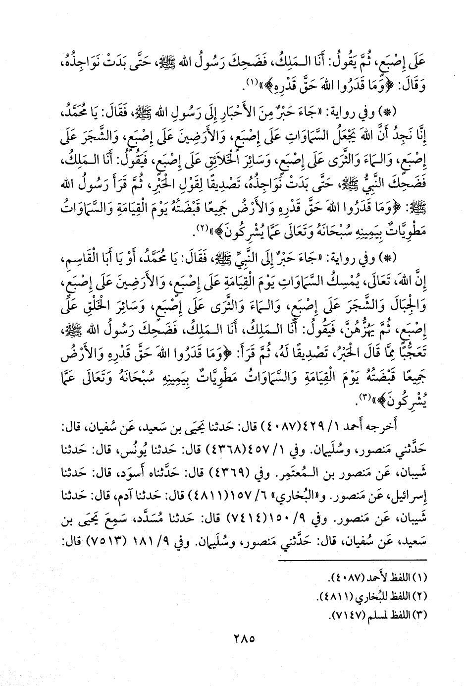 - وفي رواية: «جاء حبر إلى النبي صَلى الله عَليه وسَلم فقال: يا محمد، أو يا أبا القاسم، إن الله، تعالى، يمسك السماوات يوم القيامة على إصبع، والأرضين على إصبع، والجبال والشجر على إصبع، والماء والثرى على إصبع، وسائر الخلق على إصبع، ثم يهزهن، فيقول: أنا الملك، أنا الملك، فضحك رسول الله صَلى الله عَليه وسَلم تعجبا مما قال الحبر، تصديقا له، ثم قرأ: {وما قدروا الله حق قدره والأرض جميعا قبضته يوم القيامة والسماوات مطويات بيمينه سبحانه وتعالى عما يشركون}» (¬١).