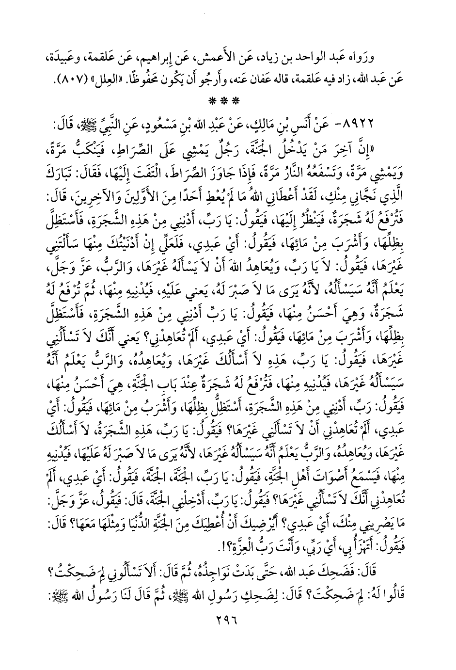 «إن آخر من يدخل الجنة، رجل يمشي على الصراط، فينكب مرة، ويمشي مرة، وتسفعه النار مرة، فإذا جاوز الصراط، التفت إليها، فقال: تبارك الذي نجاني منك، لقد أعطاني الله ما لم يعط أحدا من الأولين والآخرين، قال: فترفع له شجرة، فينظر إليها، فيقول: يا رب، أدنني من هذه الشجرة، فأستظل بظلها، وأشرب من مائها، فيقول: أي عبدي، فلعلي إن أدنيتك منها سألتني غيرها، فيقول: لا يا رب، ويعاهد الله أن لا يسأله غيرها، والرب، عز وجل، يعلم أنه سيسأله، لأنه يرى ما لا صبر له، يعني عليه، فيدنيه منها، ثم ترفع له شجرة، وهي أحسن منها، فيقول: يا رب أدنني من هذه الشجرة، فأستظل بظلها، وأشرب من مائها، فيقول: أي عبدي، ألم تعاهدني؟ يعني أنك لا تسألني غيرها، فيقول: يا رب، هذه لا أسألك غيرها، ويعاهده، والرب يعلم أنه سيسأله غيرها، فيدنيه منها، فترفع له شجرة عند باب الجنة، هي أحسن منها، فيقول: رب، أدنني من هذه الشجرة، أستظل بظلها، وأشرب من مائها، فيقول: أي عبدي، ألم تعاهدني أن لا تسألني غيرها؟ فيقول: يا رب، هذه الشجرة، لا أسألك غيرها، ويعاهده، والرب يعلم أنه سيسأله غيرها، لأنه يرى ما لا صبر له عليها، فيدنيه منها، فيسمع أصوات أهل الجنة، فيقول: يا رب، الجنة، الجنة، فيقول: أي عبدي، ألم تعاهدني أنك لا تسألني غيرها؟ فيقول: يا رب، أدخلني الجنة، قال: فيقول، عز وجل: ما يصريني منك، أي عبدي؟ أيرضيك أن أعطيك من الجنة الدنيا ومثلها معها؟ قال: فيقول: أتهزأ بي، أي ربي، وأنت رب العزة؟!.