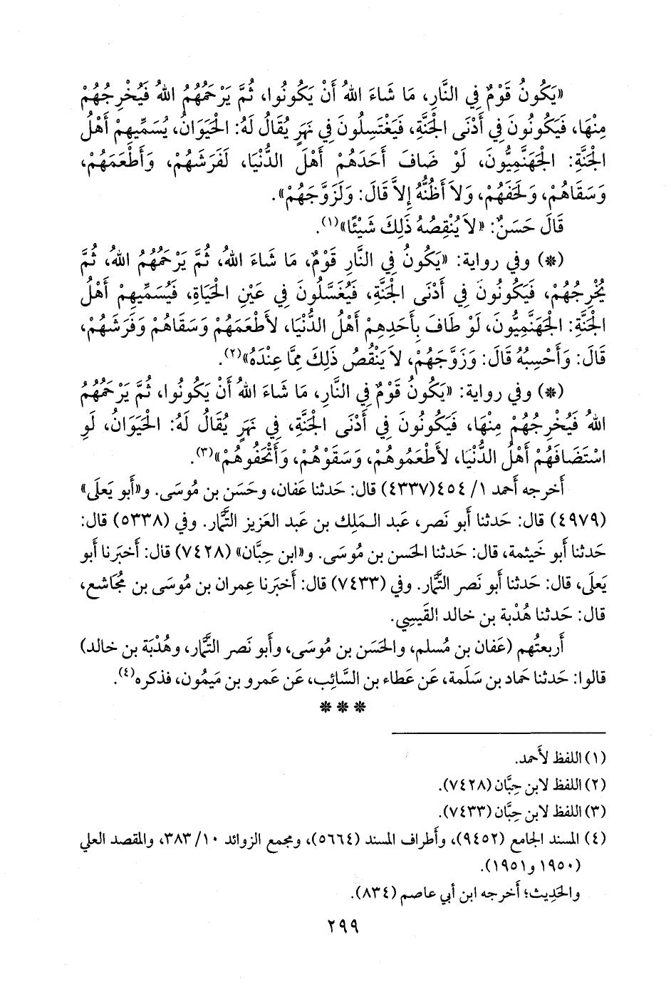 - وفي رواية: «يكون قوم في النار، ما شاء الله أن يكونوا, ثم يرحمهم الله فيخرجهم منها, فيكونون في أدنى الجنة, في نهر يقال له: الحيوان, لو استضافهم أهل الدنيا, لأطعموهم, وسقوهم, وأتحفوهم» (¬١).