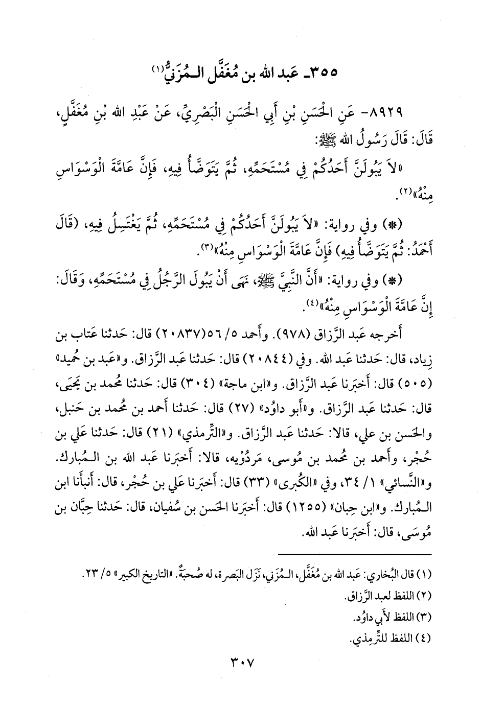 أخرجه عبد الرزاق (٩٧٨). وأحمد (٢٠٨٣٧) قال: حدثنا عتاب بن زياد، قال: حدثنا عبد الله. وفي (٢٠٨٤٤) قال: حدثنا عبد الرزاق. و «عَبد بن حُميد» (٥٠٥) قال: أخبرنا عبد الرزاق. و «ابن ماجة» (٣٠٤) قال: حدثنا محمد بن يحيى، قال: حدثنا عبد الرزاق. و «أَبو داود» (٢٧) قال: حدثنا أحمد بن محمد بن حنبل، والحسن بن علي، قالا: حدثنا عبد الرزاق. و «التِّرمِذي» (٢١) قال: حدثنا علي بن حُجْر، وأحمد بن محمد بن موسى، مردويه، قالا: أخبرنا عبد الله بن المبارك. و «النَّسَائي» ١/ ٣٤, وفي «الكبرى» (٣٣) قال: أخبرنا علي بن حُجْر، قال: أنبأنا ابن المبارك. و «ابن حِبَّان» (١٢٥٥) قال: أخبرنا الحسن بن سفيان، قال: حدثنا حِبَّان بن موسى, قال: أخبرنا عبد الله.