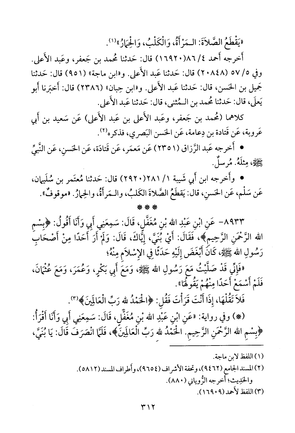 ٨٩٣٣ - عن ابن عبد الله بن مُغَفَّل, قال: سمعني أبي وأنا أقول: {بسم الله الرَّحمَن الرحيم}، فقال: أي بني، إياك, قال: ولم أر أحدا من أصحاب رسول الله صَلى الله عَليه وسَلم كان أبغض إليه حدثا في الإسلام منه؛