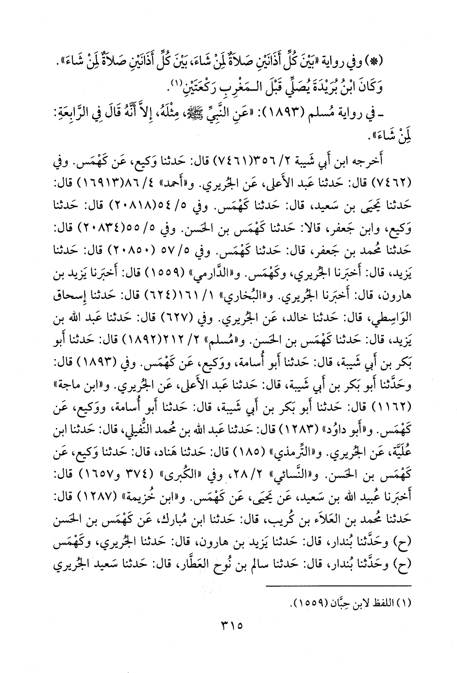 وفي ٥/ ٥٥ (٢٠٨٣٤) قال: حدثنا محمد بن جعفر، قال: حدثنا كهمس. وفي ٥/ ٥٧ (٢٠٨٥٠) قال: حدثنا يزيد، قال: أخبرنا الجُريري، وكهمس. و «الدَّارِمي» (١٥٥٩) قال: أخبرنا يزيد بن هارون, قال: أخبرنا الجُريري. و «البخاري» ١/ ١٢٧ (٦٢٤) قال: حدثنا إسحاق الواسطي، قال: حدثنا خالد, عن الجُريري. وفي (٦٢٧) قال: حدثنا عبد الله بن يزيد، قال: حدثنا كهمس بن الحسن. و «مسلم» ٢/ ٢١٢ (١٨٩٢) قال: حدثنا أَبو بكر بن أبي شيبة، قال: حدثنا أَبو أُسامة، ووكيع، عن كهمس. وفي (١٨٩٣) قال: وحدثنا أَبو بكر بن أبي شيبة، قال: حدثنا عبد الأعلى, عن الجُريري. و «ابن ماجة» (١١٦٢) قال: حدثنا أَبو بكر بن أبي شيبة، قال: حدثنا أَبو أُسامة، ووكيع، عن كهمس. و «أَبو داود» (١٢٨٣) قال: حدثنا عبد الله بن محمد النفيلي، قال: حدثنا ابن عُلَية, عن الجُريري. و «التِّرمِذي» (١٨٥) قال: حدثنا هَنَّاد، قال: حدثنا وكيع، عن كهمس بن الحسن. و «النَّسَائي» ٢/ ٢٨، وفي «الكبرى» (٣٧٤ و ١٦٥٧) قال: أخبرنا عُبيد الله بن سعيد، عن يحيى، عن كهمس. و «ابن خزيمة» (١٢٨٧) قال: حدثنا محمد بن العلاء بن كُريب، قال: حدثنا ابن مبارك، عن كهمس بن الحسن (ح) وحدثنا بُندَار، قال: حدثنا يزيد بن هارون، قال: حدثنا الجُريري، وكهمس (ح) وحدثنا بُندَار، قال: حدثنا سالم بن نوح العطار, قال: حدثنا سعيد الجُريري