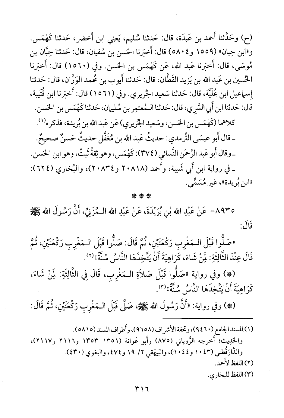 صلوا قبل المغرب ركعتين, ثم قال عند الثالثة: لمن شاء، خاف أن يحسبها الناس سنة» (¬٣).