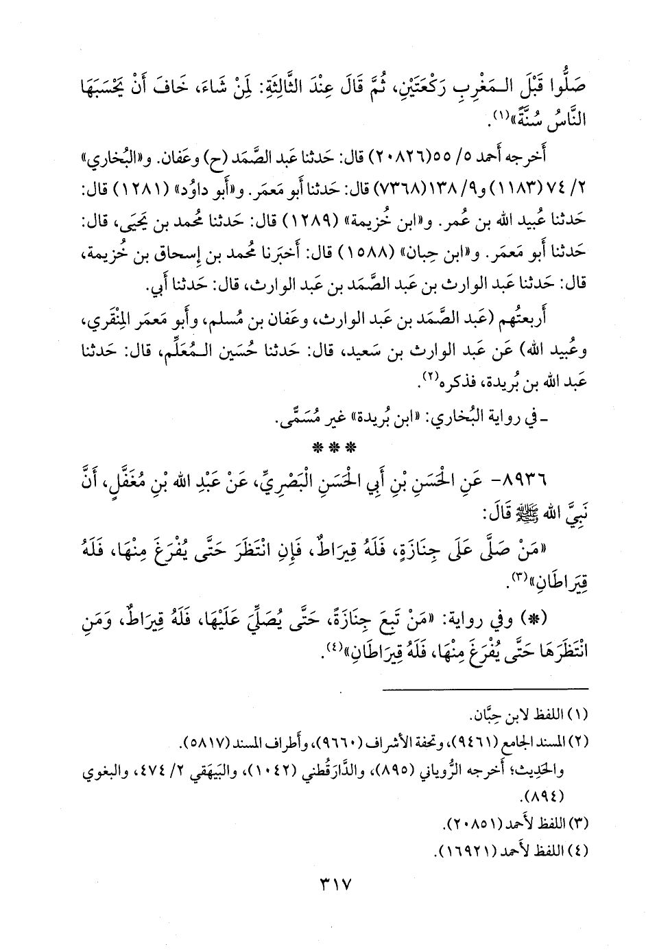 أربعتهم (عبد الصمد بن عبد الوارث، وعفان بن مسلم، وأَبو مَعمَر المنقري، وعُبيد الله) عن عبد الوارث بن سعيد، قال: حدثنا حسين المُعَلِّم، قال: حدثنا عبد الله بن بُريدة، فذكره (¬١).