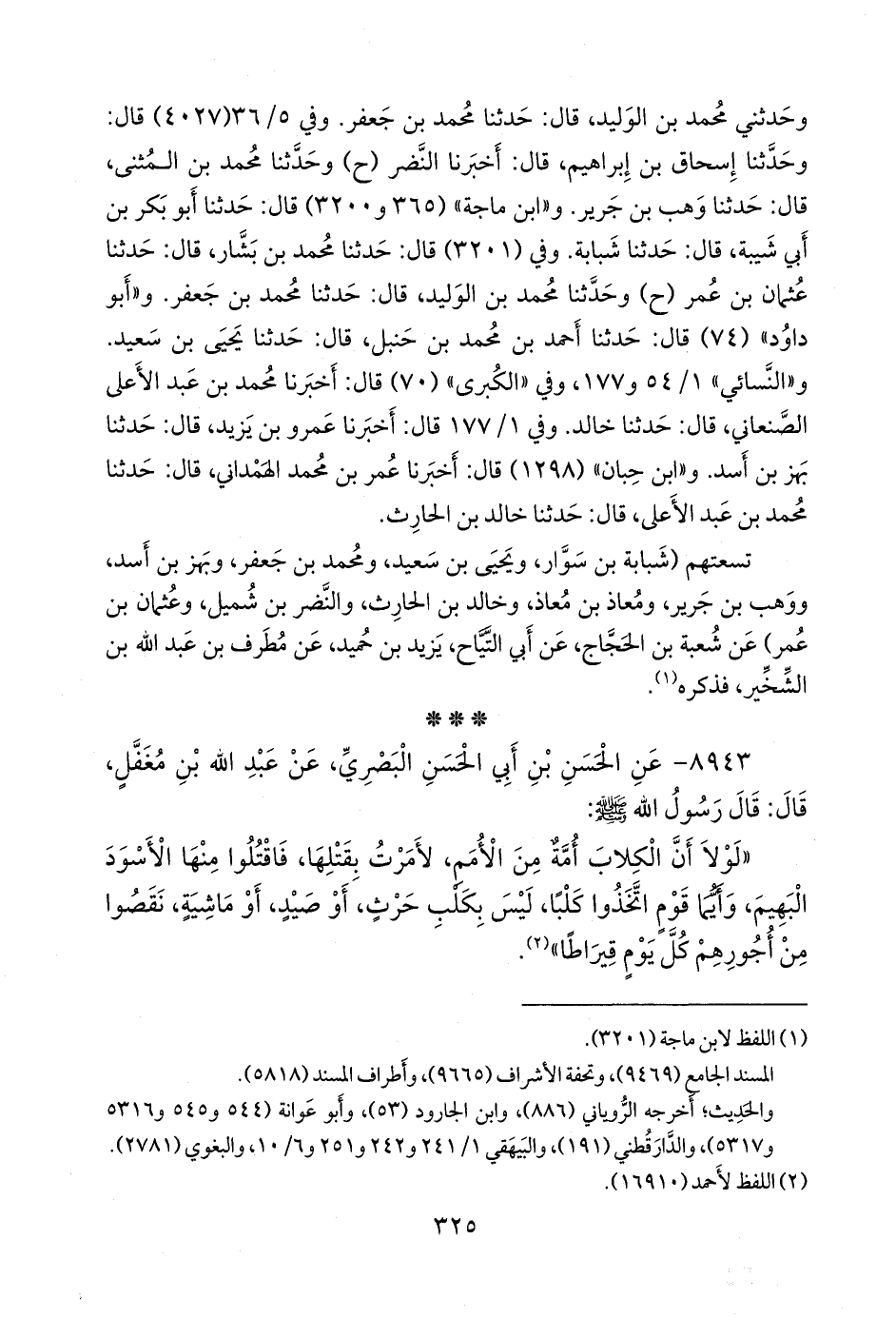 - وفي رواية: «عن أبي سفيان بن العلاء, قال: سمعت الحسن يحدث، أن رسول الله صَلى الله عَليه وسَلم قال: لولا أن الكلاب أمة من الأمم، لأمرت بقتلها, فاقتلوا منها كل أسود بهيم».