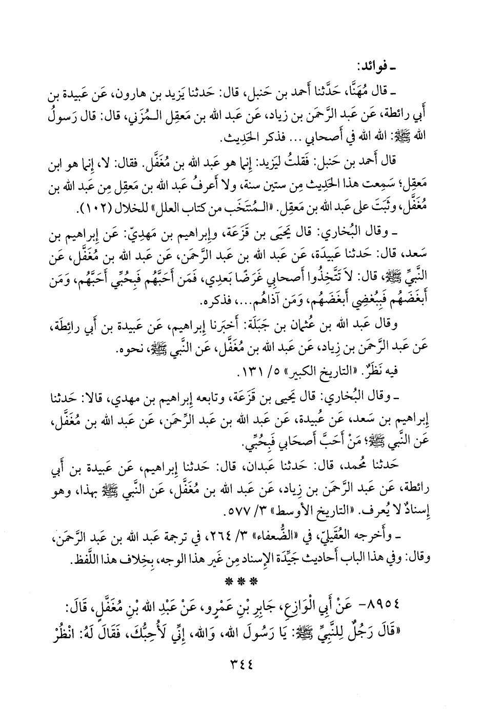 - قال مهنا: حدثنا أحمد بن حنبل، قال: حدثنا يزيد بن هارون، عن عبيدة بن أبي رائطة، عن عبد الرَّحمَن بن زياد، عن عبد الله بن معقل المزني، قال: قال رسول الله صَلى الله عَليه وسَلم: الله الله في أصحابي، فذكر الحديث.