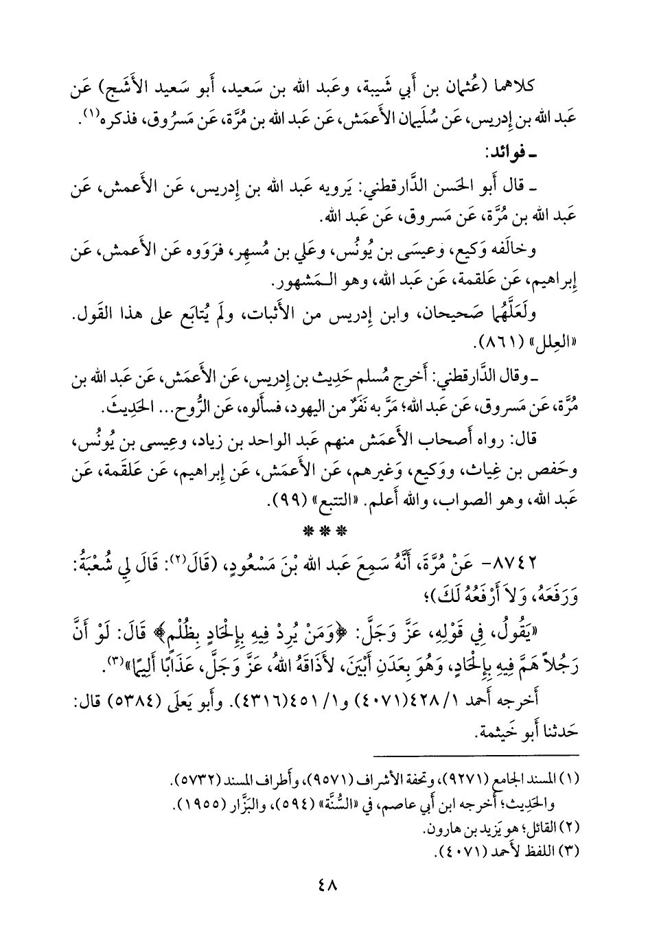 - قال أَبو الحسن الدارقُطني: يرويه عبد الله بن إدريس، عن الأعمش، عن عبد الله بن مُرَّة، عن مسروق، عن عبد الله.