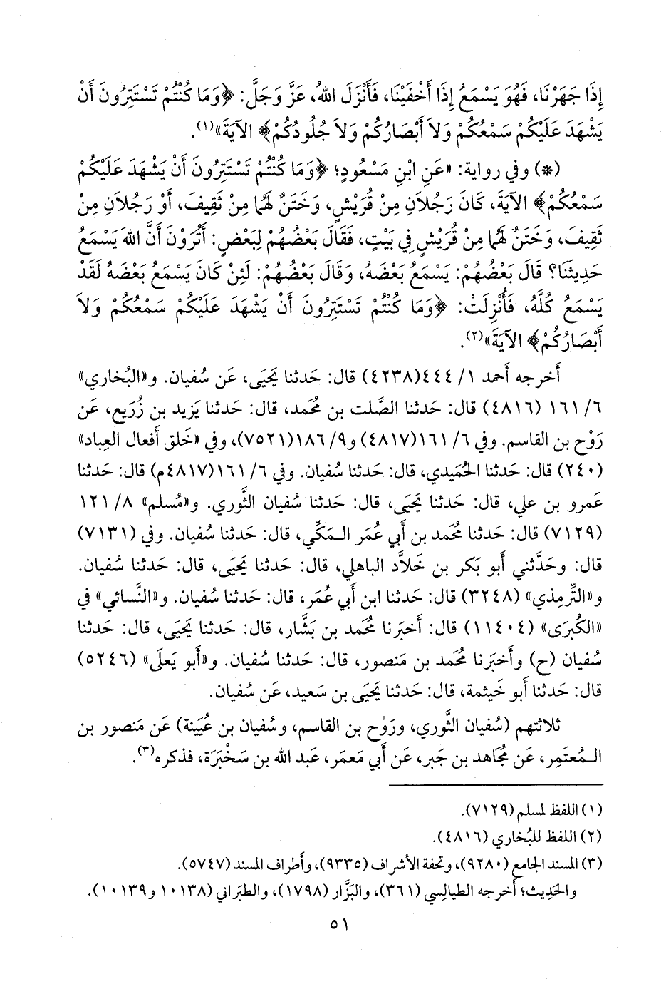 وفي ٦/ ١٢٩ (٤٨١٧) و ٩/ ١٥٢ (٧٥٢١)، وفي «خلق أفعال العباد» (٢٤٠) قال: حدثنا الحميدي، قال: حدثنا سفيان. وفي ٦/ ١٢٩ (٤٨١٧ م) قال: حدثنا عَمرو بن علي، قال: حدثنا يحيى، قال: حدثنا سفيان الثوري. و «مسلم» ٨/ ١٢١ (٧١٢٩) قال: حدثنا محمد بن أبي عمر المكي، قال: حدثنا سفيان. وفي (٧١٣١) قال: وحدثني أَبو بكر بن خلاد الباهلي، قال: حدثنا يحيى، قال: حدثنا سفيان. و «التِّرمِذي» (٣٢٤٨) قال: حدثنا ابن أبي عمر، قال: حدثنا سفيان. و «النَّسَائي» في «الكبرى» (١١٤٠٤) قال: أخبرنا محمد بن بشار، قال: حدثنا يحيى، قال: حدثنا سفيان (ح) وأخبرنا محمد بن منصور، قال: حدثنا سفيان. و «أَبو يَعلى» (٥٢٤٦) قال: حدثنا أَبو خيثمة، قال: حدثنا يحيى بن سعيد، عن سفيان.