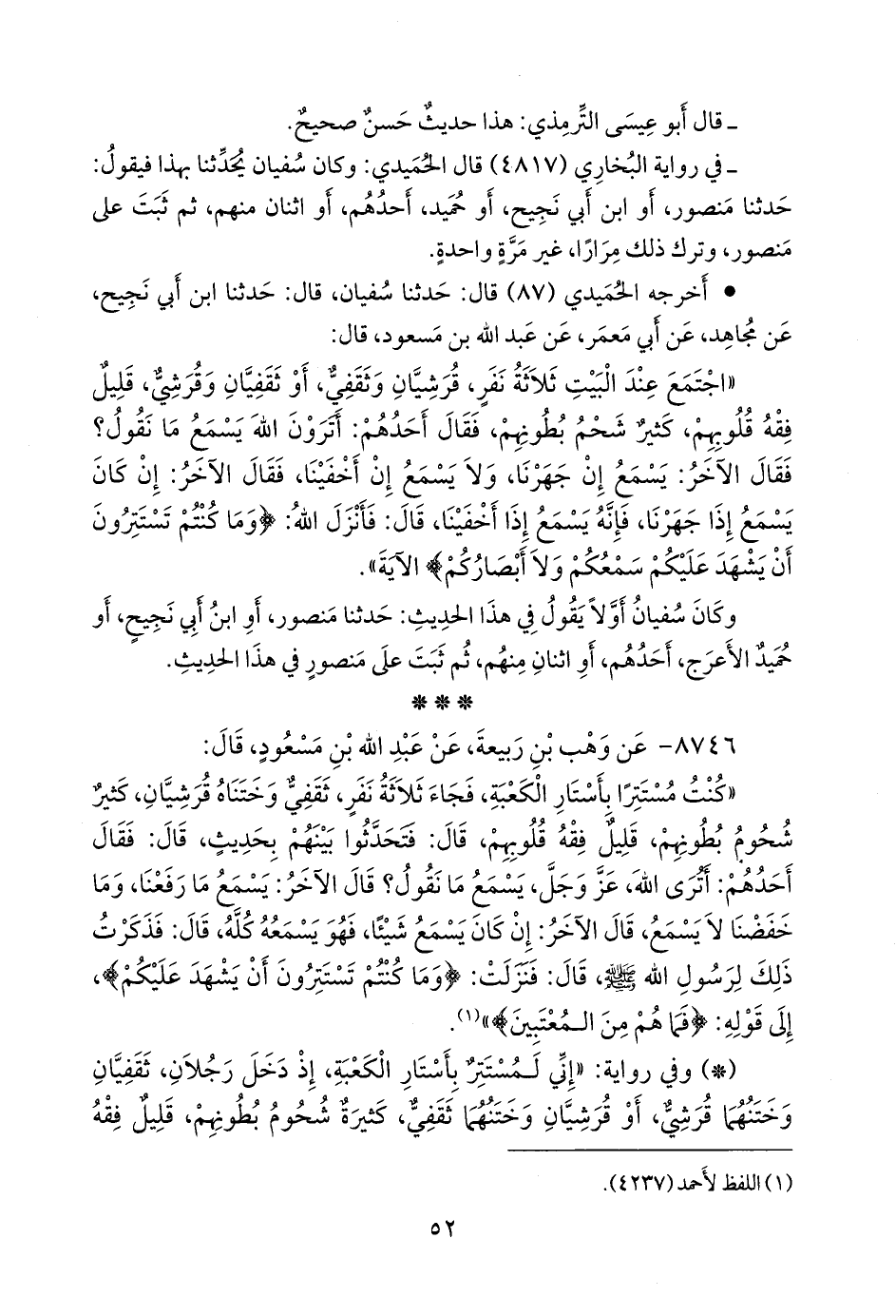 - وفي رواية: «إني لمستتر بأستار الكعبة، إذ دخل رجلان، ثقفيان وختنهما قرشي، أو قرشيان وختنهما ثقفي، كثيرة شحوم بطونهم، قليل فقه