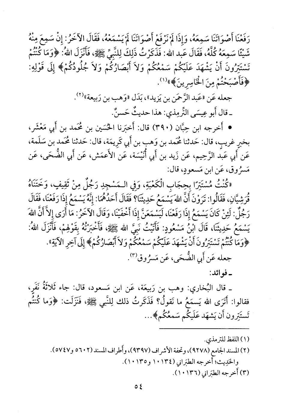 - قال البخاري: وهب بن ربيعة، عن ابن مسعود، قال: جاء ثَلاثَة نَفَرٍ، فقالوا: أَتَرَى الله يسمَعُ ما نَقول؟ فَذَكَرتُ ذلك للنبي صَلى الله عَليه وسَلم، فَنَزَلت: {وما كُنْتُم تَسْتَتِرون أَن يشهَد عليكُم سَمعُكُم}.