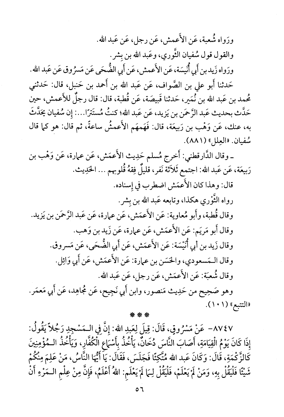 ٨٧٤٧ - عن مسروق، قال: قيل لعبد الله: إن في المسجد رجلا يقول: إذا كان يوم القيامة، أصاب الناس دخان، يأخذ بأسماع الكفار، ويأخذ المؤمنين كالزكمة، قال: وكان عبد الله متكئا فجلس، فقال: يا أيها الناس، من علم منكم شيئًا فليقل به، ومن لم يعلم، فليقل لما لم يعلم: الله أعلم، فإن من علم المرء أن