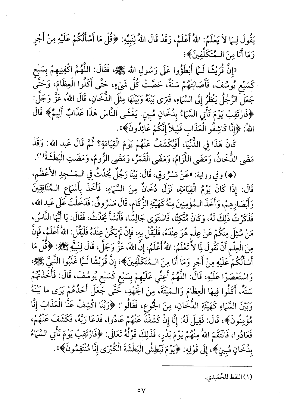 - وفي رواية: «عن مسروق، قال: بينا رجل يحدث في المسجد الأعظم، قال: إذا كان يوم القيامة، نزل دخان من السماء، فأخذ بأسماع المنافقين وأبصارهم، وأخذ المؤمنين منه كهيئة الزكام، قال مسروق: فدخلت على عبد الله، فذكرت ذلك له، وكان متكئا، فاستوى جالسا، فأنشأ يحدث، فقال: يا أيها الناس، من سئل منكم عن علم هو عنده، فليقل به، فإن لم يكن عنده فليقل: الله أعلم، فإن من العلم أن تقول لما لا تعلم: الله أعلم، إن الله، عز وجل، قال لنبيه صَلى الله عَليه وسَلم: {قل ما أسألكم عليه من أجر وما أنا من المتكلفين}؛ إن قريشا لما غلبوا النبي صَلى الله عَليه وسَلم واستعصوا عليه، قال: اللهم أعني عليهم بسبع كسبع يوسف، قال: فأخذتهم سنة، أكلوا فيها العظام والميتة، من الجهد، حتى جعل أحدهم يرى ما بينه وبين السماء كهيئة الدخان، من الجوع، فقالوا: {ربنا اكشف عنا العذاب إنا مؤمنون}، قال: فقيل له: إنا إن كشفنا عنهم عادوا، فدعا ربه، فكشف عنهم، فعادوا، فانتقم الله منهم يوم بدر، فذلك قوله تعالى: {فارتقب يوم تأتي السماء بدخان مبين}، إلى قوله: {يوم نبطش البطشة الكبرى إنا منتقمون}».