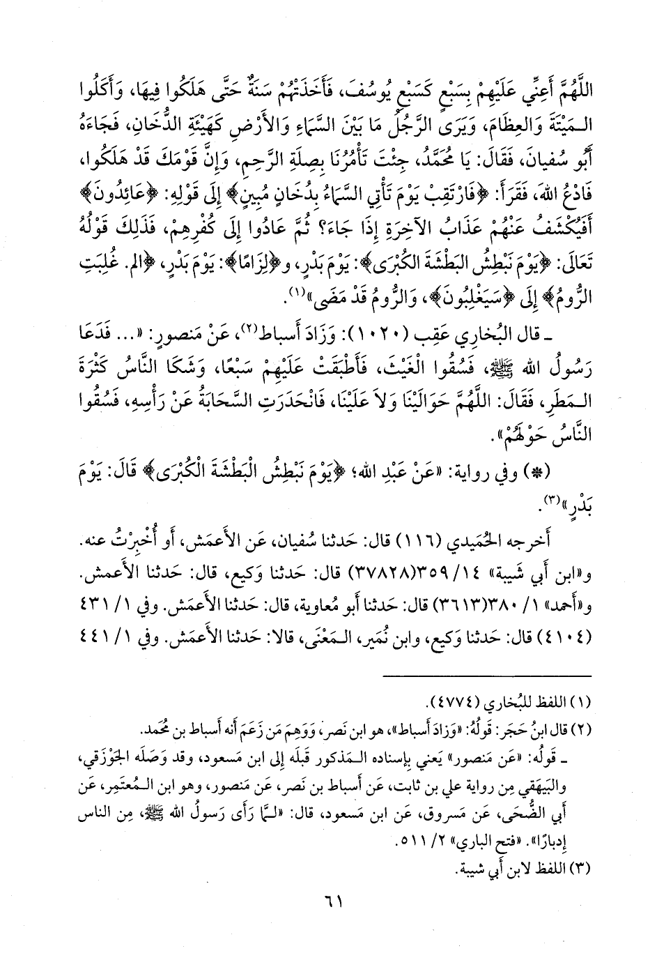 - قوله: «عن منصور» يعني بإسناده المذكور قبله إلى ابن مسعود، وقد وصله الجوزقي، والبيهقي من رواية علي بن ثابت، عن أسباط بن نصر، عن منصور، وهو ابن المُعتَمِر، عن أبي الضحى، عن مسروق، عن ابن مسعود، قال: «لما رأى رسول الله صَلى الله عَليه وسَلم من الناس إدبارا». «فتح الباري» ٢/ ٥١١.
