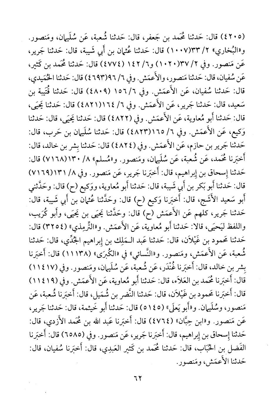 وفي ٦/ ١٣٢ (٤٨٢٣) قال: حدثنا سليمان بن حرب، قال: حدثنا جَرير بن حازم، عن الأعمش. وفي (٤٨٢٤) قال: حدثنا بشر بن خالد، قال: أخبرنا محمد، عن شعبة، عن سليمان، ومنصور. و «مسلم» ٨/ ١٣٠ (٧١٦٨) قال: حدثنا إسحاق بن إبراهيم، قال: أخبرنا جرير، عن منصور. وفي ٨/ ١٣١ (٧١٦٩) قال: حدثنا أَبو بكر بن أبي شيبة، قال: حدثنا أَبو معاوية، ووكيع (ح) قال: وحدثني أَبو سعيد الأشج، قال: أخبرنا وكيع (ح) قال: وحدثنا عثمان بن أبي شيبة، قال: حدثنا جرير، كلهم عن الأعمش (ح) قال: وحدثنا يحيى بن يحيى، وأَبو كُريب، واللفظ ليحيى، قالا: حدثنا أَبو معاوية، عن الأعمش. و «التِّرمِذي» (٣٢٥٤) قال: حدثنا محمود بن غَيلان، قال: حدثنا عبد الملك بن إبراهيم الجدي، قال: حدثنا شعبة، عن الأعمش، ومنصور. و «النَّسَائي» في «الكبرى» (١١١٣٨) قال: أخبرنا بشر بن خالد، قال: أخبرنا غُندَر، عن شعبة، عن سليمان، ومنصور. وفي (١١٤١٧) قال: أخبرنا محمد بن العلاء، قال: حدثنا أَبو معاوية، عن الأعمش. وفي (١١٤١٩) قال: أخبرنا محمود بن غَيلان، قال: حدثنا النضر بن شميل، قال: أخبرنا شعبة، عن منصور، وسليمان. و «أَبو يَعلى» (٥١٤٥) قال: حدثنا أَبو خيثمة، قال: حدثنا جرير، عن منصور. و «ابن حِبَّان» (٤٧٦٤) قال: أخبرنا عبد الله بن محمد الأزدي، قال: حدثنا إسحاق بن إبراهيم، قال: أخبرنا جرير، عن منصور. وفي (٦٥٨٥) قال: أخبرنا الفضل بن الحُبَاب، قال: حدثنا محمد بن كثير العبدي، قال: أخبرنا سفيان، قال: حدثنا الأعمش، ومنصور.