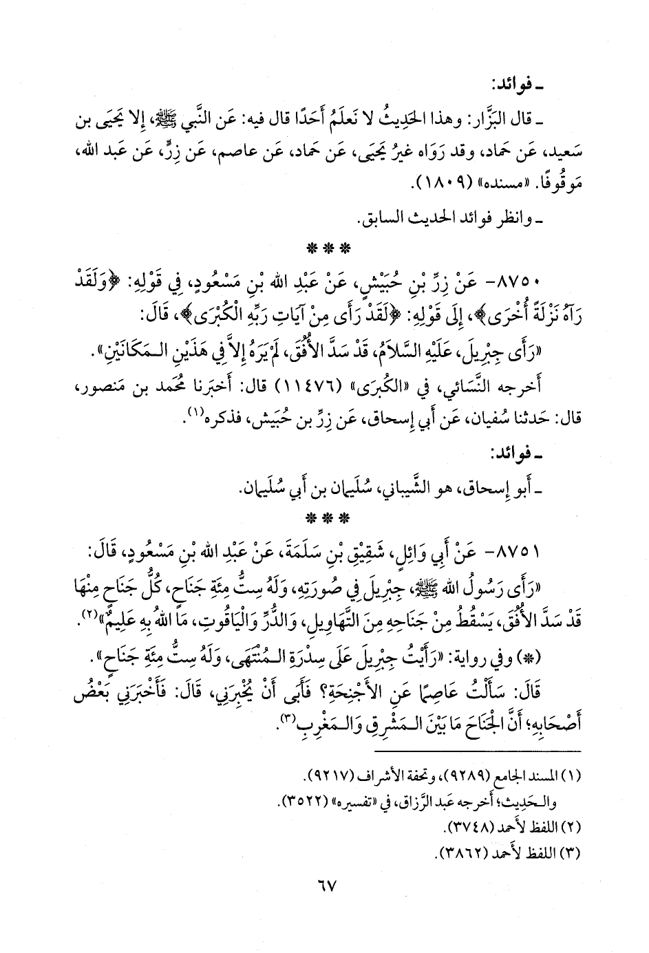 ٨٧٥٠ - عن زِرّ بن حُبَيش، عن عبد الله بن مسعود، في قوله: {ولقد رآه نزلة أخرى}، إلى قوله: {لقد رأى من آيات ربه الكبرى}، قال: