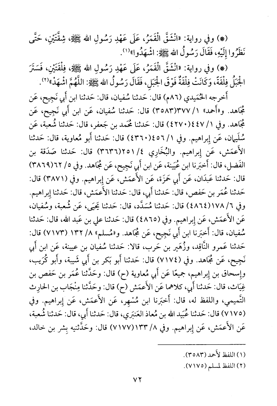 أخرجه الحُميدي (٨٦ م) قال: حدثنا سفيان، قال: حدثنا ابن أَبي نَجيح، عن مجاهد. و «أحمد» (٣٥٨٣) قال: حدثنا سفيان، عن ابن أَبي نَجيح، عن مجاهد. وفي ١/ ٤٤٧ (٤٢٧٠) قال: حدثنا محمد بن جعفر، قال: حدثنا شعبة، عن سليمان، عن إبراهيم. وفي ١/ ٤٥٦ (٤٣٦٠) قال: حدثنا أَبو معاوية، قال: حدثنا الأعمش، عن إبراهيم. والبخاري ٤/ ٢٠٦ (٣٦٣٦) قال: حدثنا صدقة بن الفضل، قال: أخبرنا ابن عُيينة، عن ابن أَبي نَجيح، عن مجاهد. وفي ٥/ ٤٩ (٣٨٦٩) قال: حدثنا عبدان، عن أبي حمزة، عن الأعمش، عن إبراهيم. وفي (٣٨٧١) قال: حدثنا عمر بن حفص، قال: حدثنا أبي، قال: حدثنا الأعمش، قال: حدثنا إبراهيم. وفي ٦/ ١٤٢ (٤٨٦٤) قال: حدثنا مُسدد، قال: حدثنا يحيى، عن شعبة، وسفيان، عن الأعمش، عن إبراهيم. وفي (٤٨٦٥) قال: حدثنا علي بن عبد الله، قال: حدثنا سفيان، قال: أخبرنا ابن أَبي نَجيح، عن مجاهد. و «مسلم» ٨/ ١٣٢ (٧١٧٣) قال: حدثنا عَمرو الناقد، وزهير بن حرب، قالا: حدثنا سفيان بن عُيينة، عن ابن أَبي نَجيح، عن مجاهد. وفي (٧١٧٤) قال: حدثنا أَبو بكر بن أبي شيبة، وأَبو كُريب، وإسحاق بن إبراهيم، جميعا عن أبي معاوية (ح) قال: وحدثنا عمر بن حفص بن غياث، قال: حدثنا أبي، كلاهما عن الأعمش (ح) قال: وحدثنا منجاب بن الحارث التميمي، واللفظ له, قال: أخبرنا ابن مُسهِر، عن الأعمش، عن إبراهيم. وفي (٧١٧٥) قال: حدثنا عُبيد الله بن معاذ العنبري، قال: حدثنا أبي، قال: حدثنا شعبة، عن الأعمش، عن إبراهيم. وفي ٨/ ١٣٣ (٧١٧٧) قال: وحدثنيه بشر بن خالد،