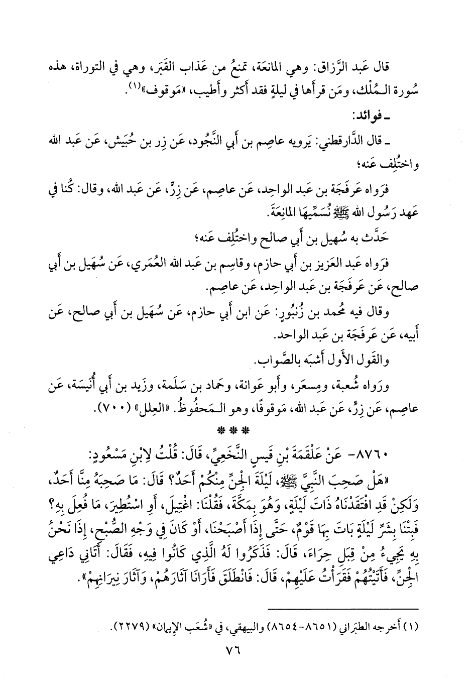 - قال الدارقُطني: يرويه عاصم بن أبي النجود، عن زِرّ بن حُبَيش، عن عبد الله واختُلِف عنه؛