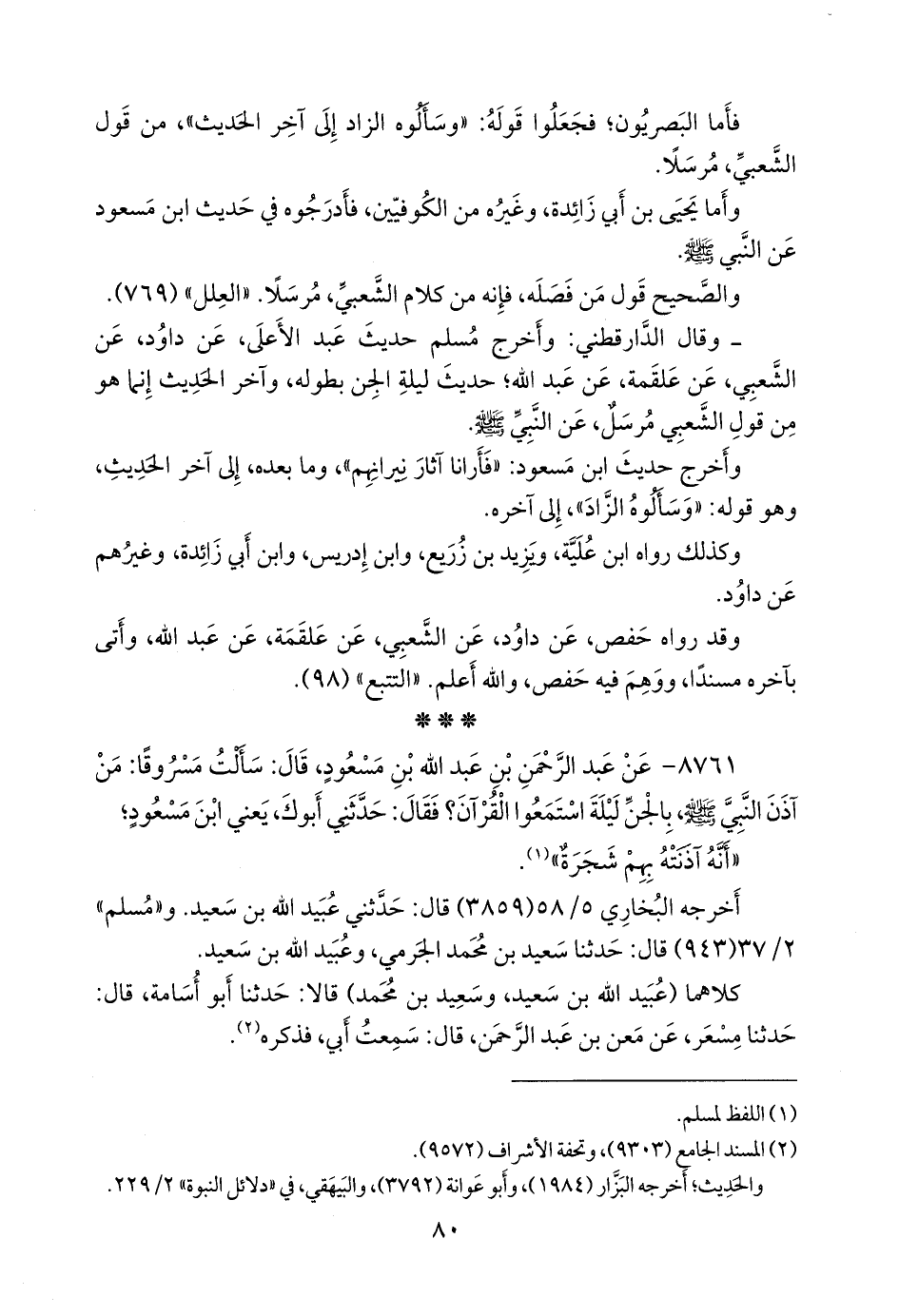 ٨٧٦١ - عن عبد الرَّحمَن بن عبد الله بن مسعود، قال: سألت مسروقا: من آذن النبي صَلى الله عَليه وسَلم بالجن ليلة استمعوا القرآن؟ فقال: حدثني أَبوك، يعني ابن مسعود؛