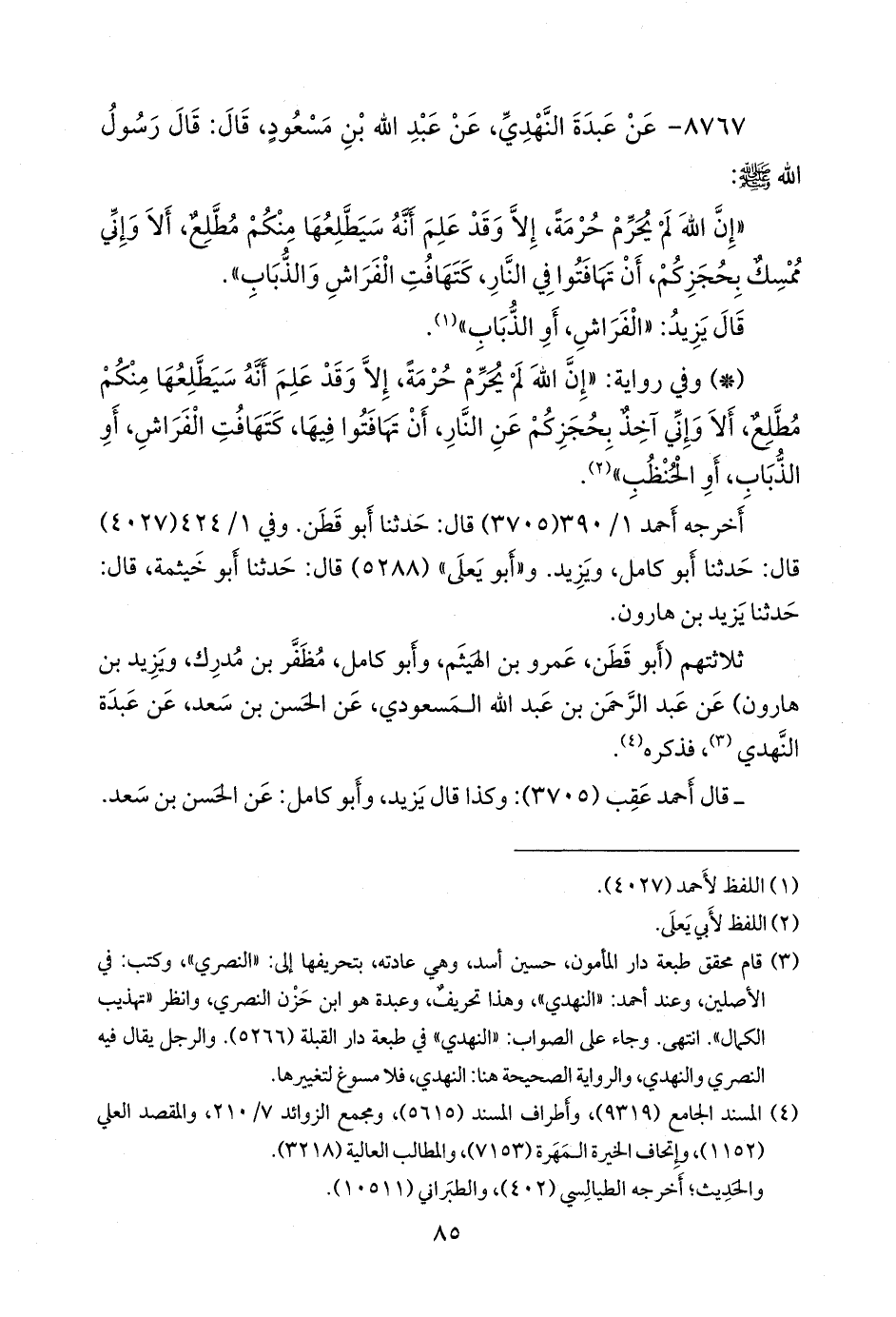 - وأخرجه أحمد (٣٧٠٥) و ١/ ٤٢٤ (٤٠٢٨) قال: حدثنا روح، قال: حدثنا المَسعودي، قال: أخبرنا أَبو المغيرة، عن الحسن بن سعد، عن عبدة النهدي، عن عبد الله بن مسعود، فذكر الحديث، وقال: الفراش والذباب (¬١).
