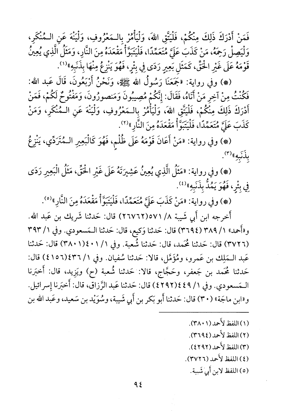 - وفي رواية: «من كذب علي متعمدا، فليتبوأ مقعده من النار» (¬٢).