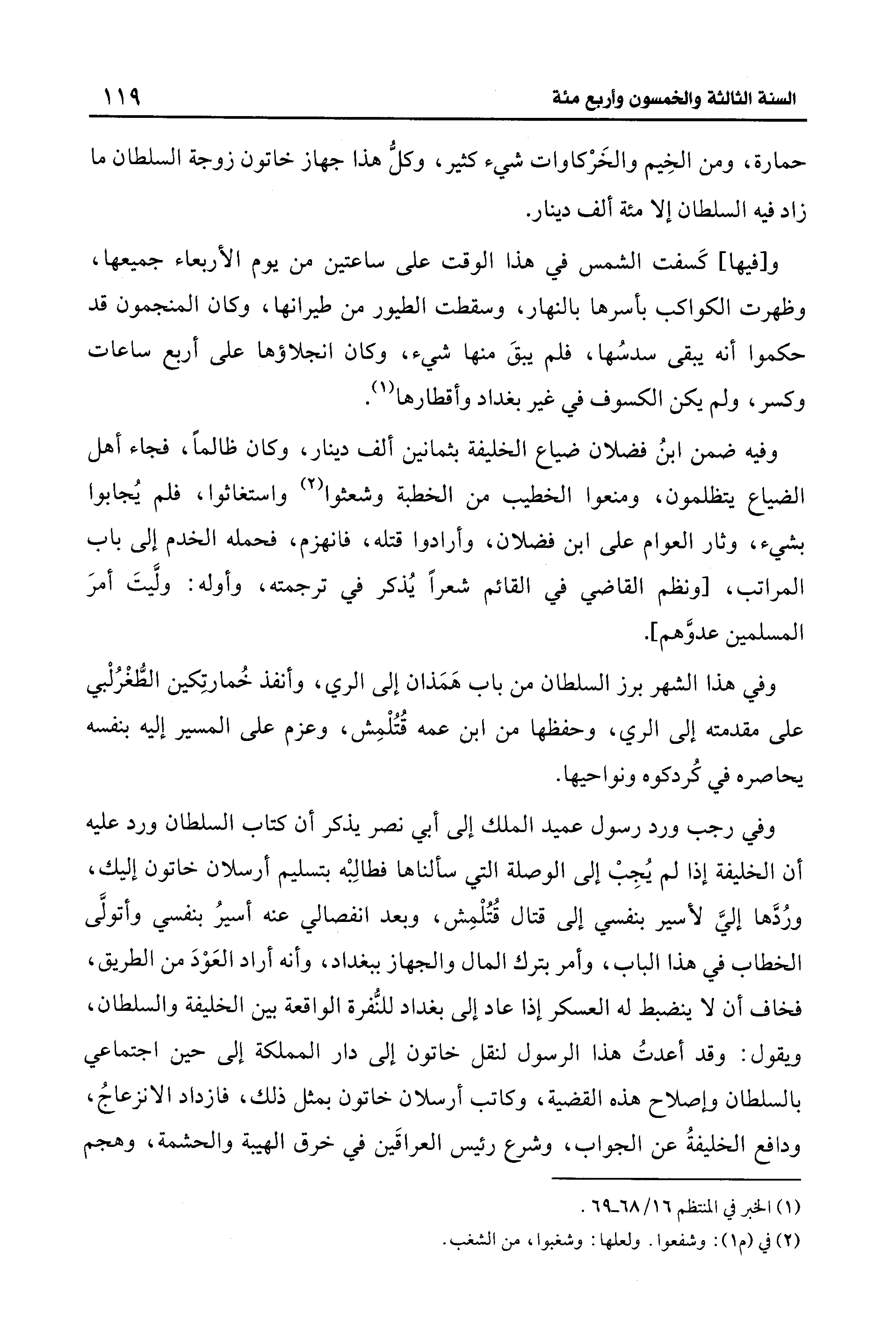 و[فيها] كَسفت الشمس في هذا الوقت على ساعتين من يوم الأربعاء جميعها، وظهرت الكواكب بأسرها بالنهار، وسقطت الطيور من طيرانها، وكان المنجمون قد حكموا أنه يبقى سدسُها، فلم يبقَ منها شيء، وكان انجلاؤها على أربع ساعات وكسر، ولم يكن الكسوف في غير بغداد وأقطارها (¬1).