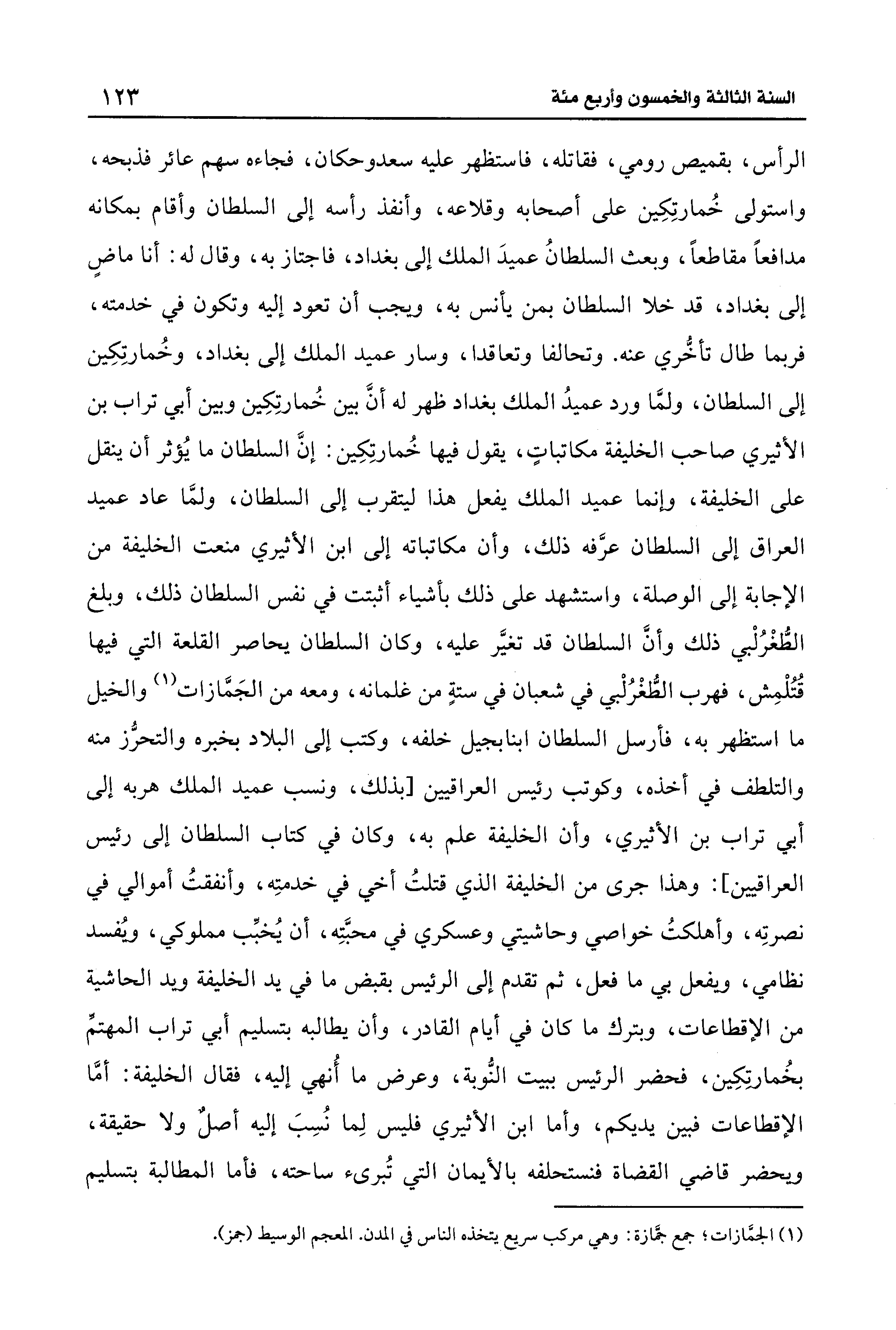 الرأس، بقميص رومي، فقاتله، فاستظهر عليه سعدوحكان، فجاءه سهم عائر فذبحه، واستولى خُمارتِكِين على أصحابه وقلاعه، وأنفذ رأسه إلى السلطان وأقام بمكانه مدافعًا مقاطعًا، وبعث السلطانُ عميدَ الملك إلى بغداد، فاجتاز به، وقال له: أنا ماضٍ إلى بغداد، قد خلا السلطان بمن يأنس به، ويجب أن تعود إليه وتكون في خدمته، فربما طال تأخّري عنه. وتحالفا وتعاقدا، وسار عميد الملك إلى بغداد، وخُمارتِكِين إلى السلطان، ولمّا ورد عميدُ الملك بغداد ظهر له أنَّ بين خُمارتِكِين وبين أبي تراب بن الأثيري صاحب الخليفة مكاتباتٍ، يقول فيها خُمارتِكِين: إنَّ السلطان ما يُؤثر أن ينقل على الخليفة، وإنما عميد الملك يفعل هذا ليتقرب إلى السلطان، ولمّا عاد عميد العراق إلى السلطان عرَّفه ذلك، وأن مكاتباته إلى ابن الأثيري منعت الخليفة من الإجابة إلى الوصلة، واستشهد على ذلك بأشياء أثبتت في نفس السلطان ذلك، وبلغ الطّغْرُلْبي ذلك وأنَّ السلطان قد تغيَّر عليه، وكان السلطان يحاصر القلعة التي فيها قُتُلْمِش، فهرب الطُّغْرُلْبي في شعبان في ستةٍ من غلمانه، ومعه من الجَمّازات (¬1) والخيل ما استظهر به، فأرسل السلطان ابنابجيل خلفه، وكتب إلى البلاد بخبره والتحرُّز منه والتلطف في أخذه، وكوتب رئيس العراقيين [بذلك، ونسب عميد الملك هربه إلى أبي تراب بن الأثيري، وأن الخليفة علم به، وكان في كتاب السلطان إلى رئيس العراقيين]: وهذا جرى من الخليفة الذي قتلتُ أخي في خدمتِه، وأنفقتُ أموالي في نصرتِه، وأهلكتُ خواصي وحاشيتي وعسكري في محبَّتِه، أن يُخبِّب مملوكي، ويُفسد نظامي، ويفعل بي ما فعل، ثم تقدم إلى الرئيس بقبض ما في يد الخليفة ويد الحاشية من الإقطاعات، وبترك ما كان في أيام القادر، وأن يطالبه بتسليم أبي تراب المهتمّ بخُمارتكِين، فحضر الرئيس ببيت النُّوبة، وعرض ما أُنهي إليه، فقال الخليفة: أمَّا الإقطاعات فبين يديكم، وأما ابن الأثيري فليس لِما نُسِبَ إليه أصلٌ ولا حقيقة، ويحضر قاضي القضاة فنستحلفه بالأيمان التي تُبرئ ساحته، فأما المطالبة بتسليم