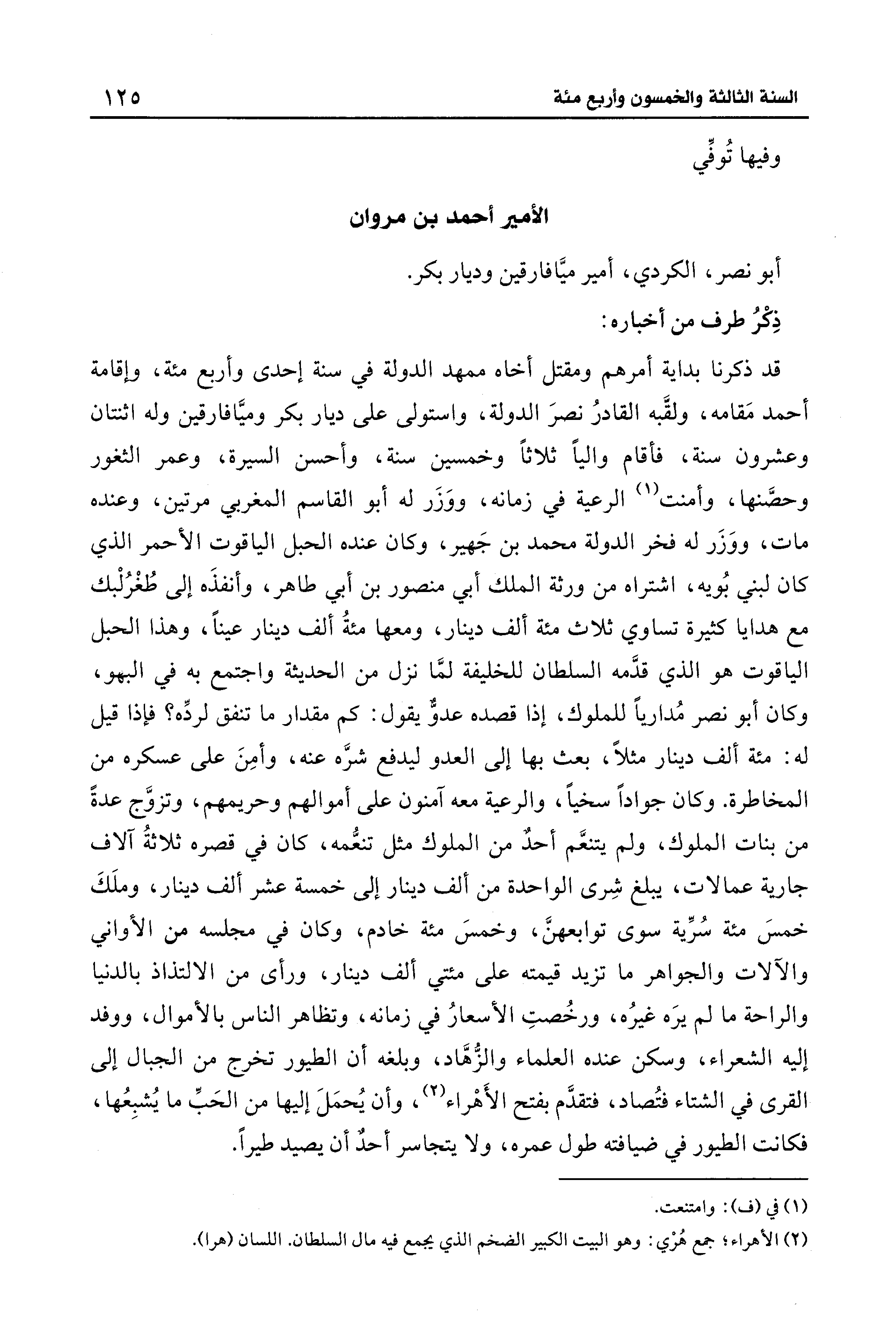 قد ذكرنا بداية أمرهم ومقتل أخاه ممهد الدولة في سنة إحدى وأربع مئة، وإقامة أحمد مَقامه، ولقَّبه القادرُ نصرَ الدولة، واستولى على ديار بكر وميّافارقين وله اثنتان وعشرون سنة، فأقام واليًا ثلاثًا وخمسين سنة، وأحسن السيرة، وعمر الثغور وحصَّنها، وأمنت (¬1) الرعية في زمانه، ووَزَر له أبو القاسم المغربي مرتين، وعنده مات، ووَزَر له فخر الدولة محمد بن جَهير، وكان عنده الحبل الياقوت الأحمر الذي كان لبني بُويه، اشتراه من ورثة الملك أبي منصور بن أبي طاهر، وأنفذَه إلى طُغْرُلْبك مع هدايا كثيرة تساوي ثلاث مئة ألف دينار، ومعها مئةُ ألف دينار عينًا، وهذا الحبل الياقوت هو الذي قدَّمه السلطان للخليفة لمّا نزل من الحديثة واجتمع به في البهو، وكان أبو نصر مُداريًا للملوك، إذا قصده عدوّ يقول: كم مقدار ما تنفق لردِّه؟ فإذا قيل له: مئة ألف دينار مثلًا، بعث بها إلى العدو ليدفع شرَّه عنه، وأمِنَ على عسكره من المخاطرة. وكان جوادًا سخيًّا، والرعية معه آمنون على أموالهم وحريمهم، وتزوَّج عدة من بنات الملوك، ولم يتنعَّم أحد من الملوك مثل تنعُّمه، كان في قصره ثلاثةُ آلاف جارية عمالات، يبلغ شِرى الواحدة من ألف دينار إلى خمسة عشر ألف دينار، وملَكَ خمسَ مئة سُرِّية سوى توابعهنَّ، وخمسَ مئة خادم، وكان في مجلسه من الأواني والآلات والجواهر ما تزيد قيمته على مئتي ألف دينار، ورأى من الالتذاذ بالدنيا والراحة ما لم يرَه غيرُه، ورخُصتِ الأسعارُ في زمانه، وتظاهر الناس بالأموال، ووفد إليه الشعراء، وسكن عنده العلماء والزُّهّاد، وبلغه أن الطيور تخرج من الجبال إلى القرى في الشتاء فتُصاد، فتقدَّم بفتح الأَهْراء (¬2)، وأن يُحمَلَ إليها من الحَبِّ ما يُشبِعُها، فكانت الطيور في ضيافته طول عمره، ولا يتجاسر أحدٌ أن يصيد طيرًا.