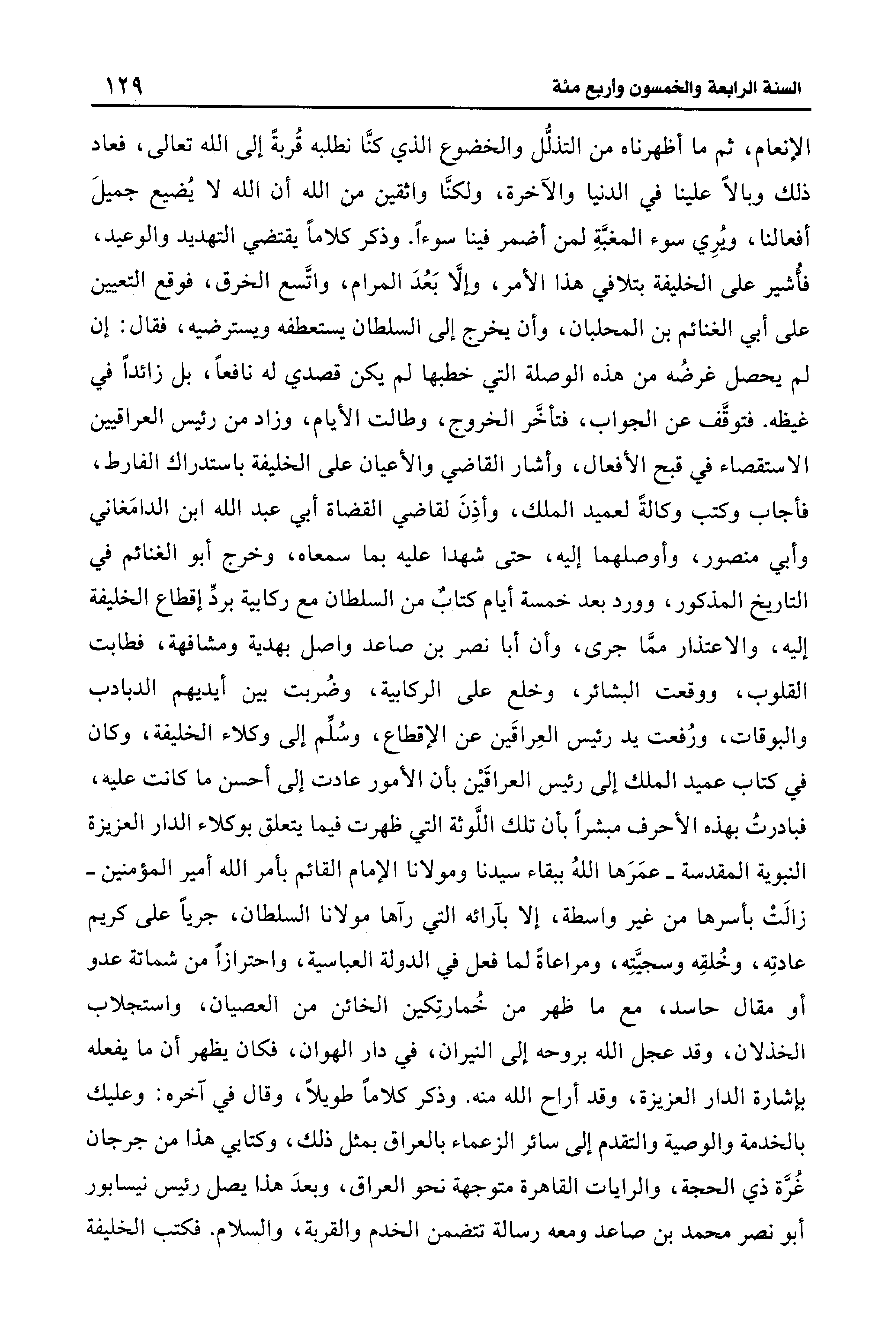 الإنعام، ثم ما أظهرناه من التذلُّل والخضوع الذي كنَّا نطلبه قُربةً إلى الله تعالى، فعاد ذلك وبالًا علينا في الدنيا والآخرة، ولكنَّا واثقين من الله أن الله لا يُضيع جميلَ أفعالنا، ويرِي سوء المغبَّةِ لمن أضمر فينا سوءًا. وذكر كلامًا يقتضي التهديد والوعيد، فأُشير على الخليفة بتلافي هذا الأمر، وإلَّا بَعُدَ المرام، واتَّسع الخرق، فوقع التعيين على أبي الغنائم بن المحلبان، وأن يخرج إلى السلطان يستعطفه ويسترضيه، فقال: إن لم يحصل غرضُه من هذه الوصلة التي خطبها لم يكن قصدي له نافعًا، بل زائدًا في غيظه. فتوقَّف عن الجواب، فتأخَّر الخروج، وطالت الأيام، وزاد من رئيس العراقيين الاستقصاء في قبح الأفعال، وأشار القاضي والأعيان على الخليفة باستدراك الفارط، فأجاب وكتب وكالةً لعميد الملك، وأذِنَ لقاضي القضاة أبي عبد الله بن الدامَغاني وأبي منصور، وأوصلهما إليه، حتى شهدا عليه بما سمعاه، وخرج أبو الغنائم في التاريخ المذكور، وورد بعد خمسة أيام كتابٌ من السلطان مع ركابية بردِّ إقطاع الخليفة إليه، والاعتذار ممَّا جرى، وأن أبا نصر بن صاعد واصل بهدية ومشافهة، فطابت القلوب، ووقعت البشائر، وخلع على الركابية، وضُربت بين أيديهم الدبادب والبوقات، ورُفعت يد رئيس العِراقَين عن الإقطاع، وسُلِّم إلى وكلاء الخليفة، وكان في كتاب عميد الملك إلى رئيس العراقَين بأن الأمور عادت إلى أحسن ما كانت عليه، فبادرتُ بهذه الأحرف مبشرًا بأن تلك اللَّوثة التي ظهرت فيما يتعلق بوكلاء الدار العزيزة النبوية المقدسة -عمَرَها اللهُ ببقاء سيدنا ومولانا الإمام القائم بأمر الله أمير المؤمنين- زالتْ بأسرها من غير واسطة، إلا بآرائه التي رآها مولانا السلطان، جريًا على كريم عادتِه، وخُلقِه وسجيَّتِه، ومراعاةً لما فعل في الدولة العباسية، واحترازًا من شماتة عدو أو مقال حاسد، مع ما ظهر من خُمارتِكين الخائن من العصيان، واستجلاب الخذلان، وقد عجل الله بروحه إلى النيران، في دار الهوان، فكان يظهر أن ما يفعله بإشارة الدار العزيزة، وقد أراح الله منه. وذكر كلامًا طويلًا، وقال في آخره: وعليك بالخدمة والوصية والتقدم إلى سائر الزعماء بالعراق بمثل ذلك، وكتابي هذا من جرجان غُرَّة ذي الحجة، والرايات القاهرة متوجهة نحو العراق، وبعدَ هذا يصل رئيس نيسابور أبو نصر محمد بن صاعد ومعه رسالة تتضمن الخدم والقربة، والسلام. فكتب الخليفة