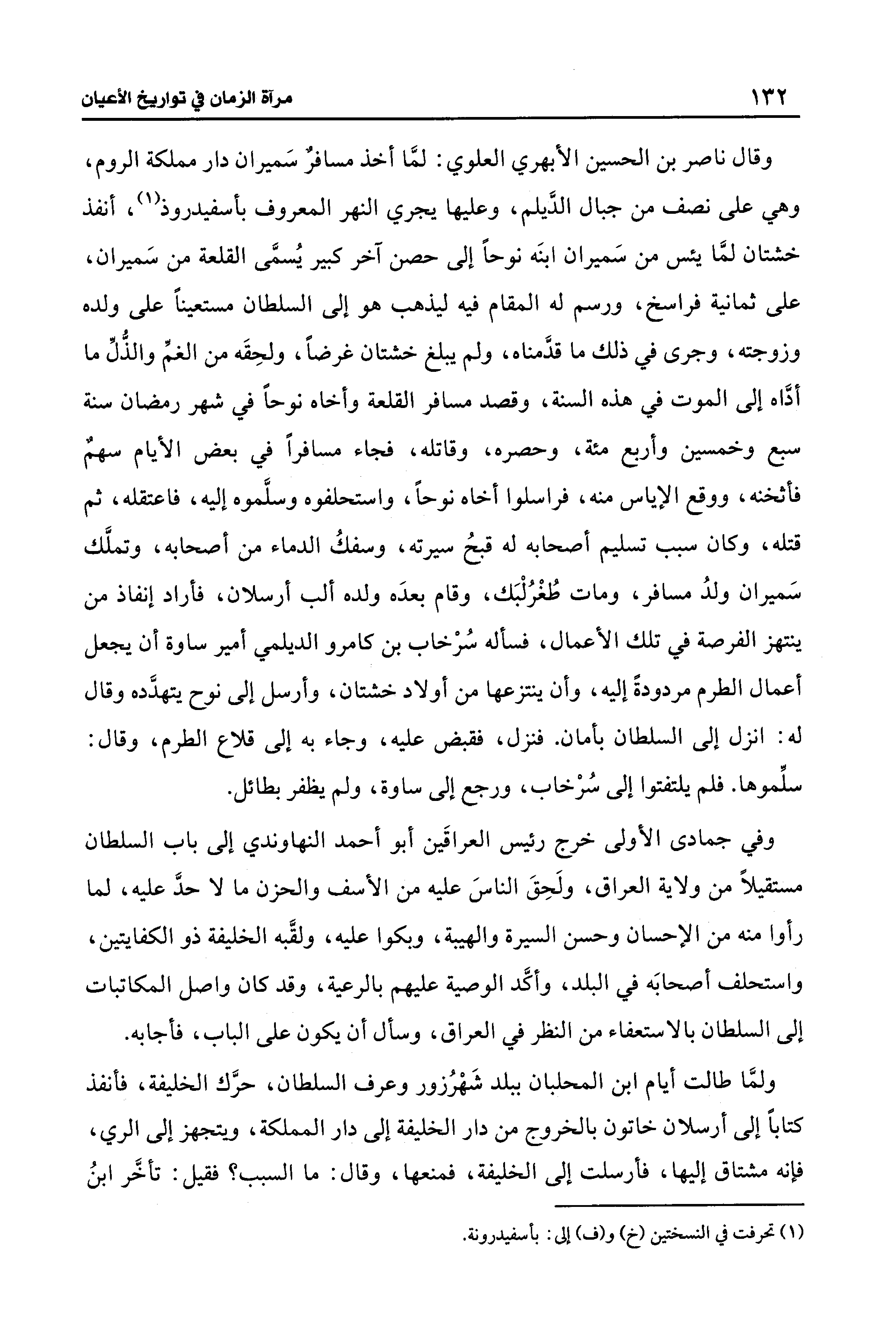 وقال ناصر بن الحسين الأبهري العلوي: لمَّا أخذ مسافرٌ سَميران دار مملكة الروم، وهي على نصف من جبال الدَّيلم، وعليها يجري النهر المعروف بأسفيدروذ (¬1)، أنفذ خشتان لمَّا يئس من سَميران ابنَه نوحًا إلى حصن آخر كبير يُسمَّى القلعة من سَميران، على ثمانية فراسخ، ورسم له المقام فيه ليذهب هو إلى السلطان مستعينًا على ولده وزوجته، وجرى في ذلك ما قدَّمناه، ولم يبلغ خشتان غرضًا، ولحِقَه من الغمِّ والذُّلِّ ما أدَّاه إلى الموت في هذه السنة، وقصد مسافر القلعة وأخاه نوحًا في شهر رمضان سنة سبع وخمسين وأربع مئة، وحصره، وقاتله، فجاء مسافرًا في بعض الأيام سهمٌ فأثخنه، ووقع الإياس منه، فراسلوا أخاه نوحًا، واستحلفوه وسلَّموه إليه، فاعتقله، ثم قتله، وكان سبب تسليم أصحابه له قبحُ سيرته، وسفكُ الدماء من أصحابه، وتملَّك سَميران ولدُ مسافر، ومات طُغْرُلْبَك، وقام بعدَه ولده ألب أرسلان، فأراد إنفاذ من ينتهز الفرصة في تلك الأعمال، فسأله سُرْخاب بن كامرو الديلمي أمير ساوة أن يجعل أعمال الطرم مردودةً إليه، وأن ينتزعها من أولاد خشتان، وأرسل إلى نوح يتهدَّده وقال له: انزل إلى السلطان بأمان. فنزل، فقبض عليه، وجاء به إلى قلاع الطرم، وقال: سلِّموها. فلم يلتفتوا إلى سُرْخاب، ورجع إلى ساوة، ولم يظفر بطائل.