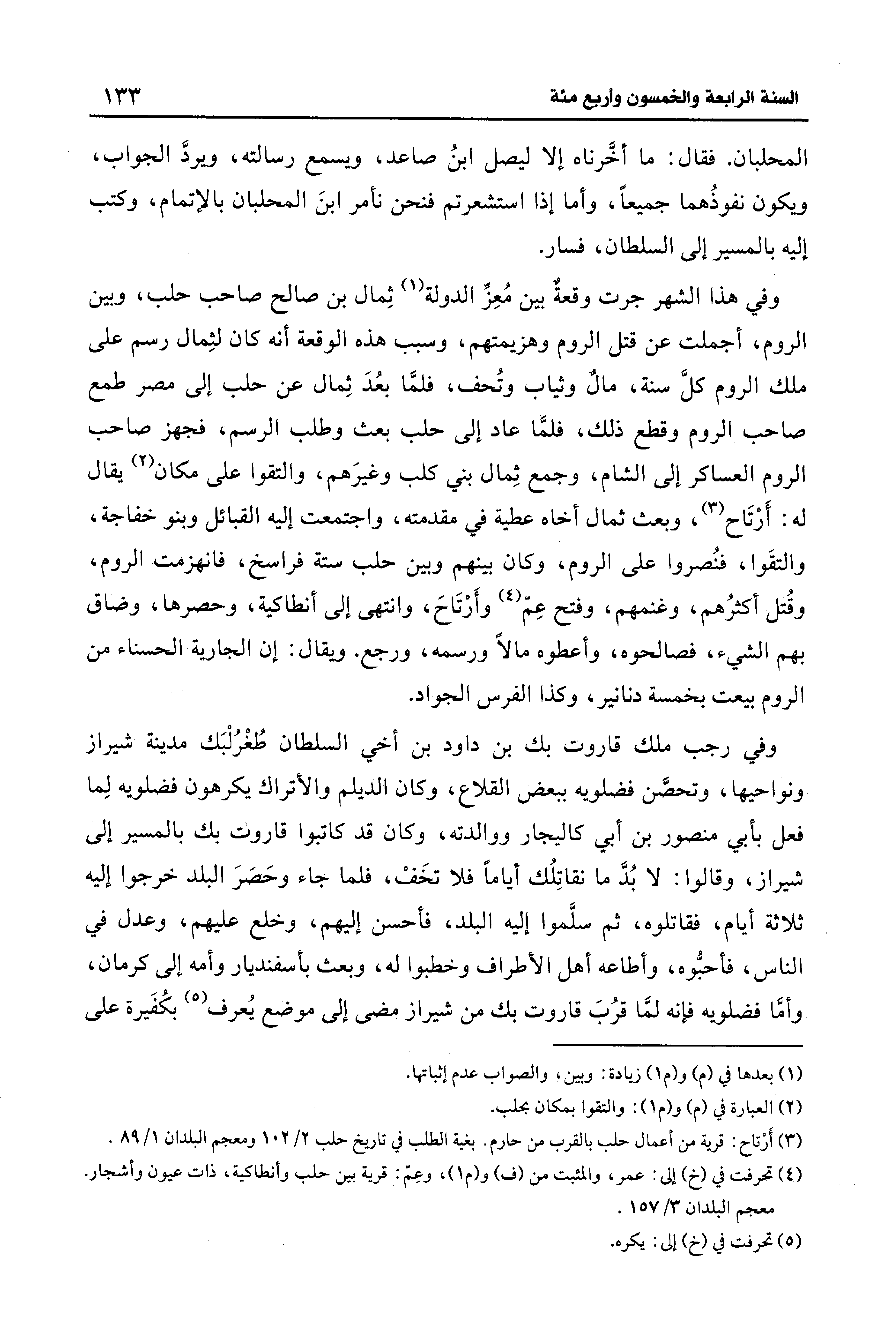 وفي هذا الشهر جرت وقعةٌ بين مُعِزِّ الدولة (¬1) ثِمال بن صالح صاحب حلب، وبين الروم، أجملت عن قتل الروم وهزيمتهم، وسبب هذه الوقعة أنه كان لثِمال رسم على ملك الروم كلَّ سنة، مالٌ وثياب وتُحف، فلمَّا بعُدَ ثِمال عن حلب إلى مصر طمع صاحب الروم وقطع ذلك، فلمَّا عاد إلى حلب بعث وطلب الرسم، فجهز صاحب الروم العساكر إلى الشام، وجمع ثِمال بني كلب وغيرَهم، والتقوا على مكان (¬2) يقال له: أَرْتَاح (¬3)، وبعث ثمال أخاه عطية في مقدمته، واجتمعت إليه القبائل وبنو خفاجة، والتقَوا، فنُصروا على الروم، وكان بينهم وبين حلب ستة فراسخ، فانهزمت الروم، وقُتل أكثرُهم، وغنمهم، وفتح عِمّ (¬4) وأَرْتَاحَ، وانتهى إلى أنطاكية، وحصرها، وضاق بهم الشيء، فصالحوه، وأعطوه مالًا ورسمه، ورجع. ويقال: إن الجارية الحسناء من الروم بيعت بخمسة دنانير، وكذا الفرس الجواد.