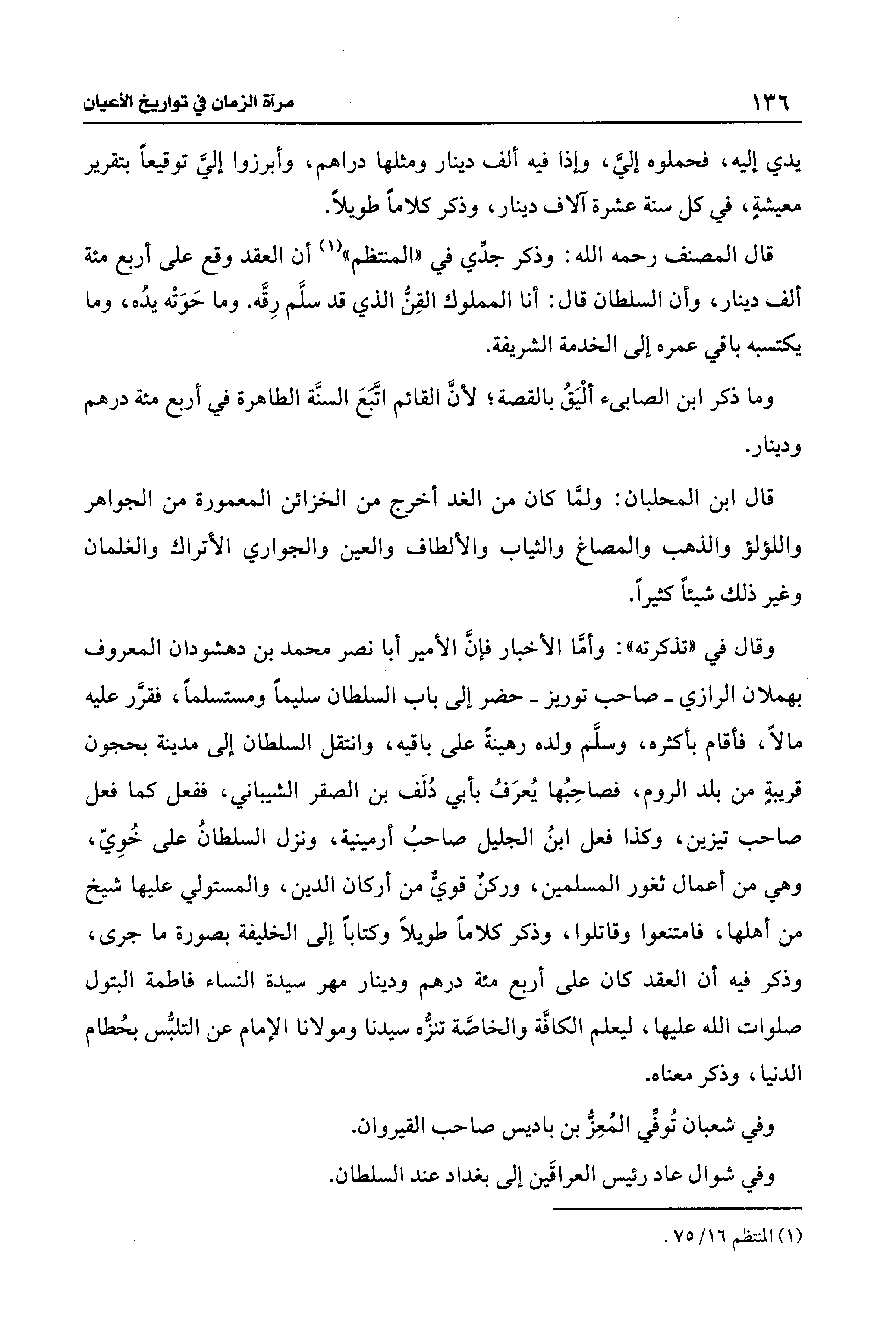 وقال في "تذكرته": وأمَّا الأخبار فإنَّ الأمير أبا نصر محمد بن دهشودان المعروف بهملان الرازي -صاحب توريز- حضر إلى باب السلطان سليمًا ومستسلمًا، فقرَّر عليه مالًا، فأقام بأكثره، وسلَّم ولده رهينةً على باقيه، وانتقل السلطان إلى مدينة بحجون قريبةٍ من بلد الروم، فصاحِبُها يُعرَفُ بأبي دُلَف بن الصقر الشيباني، ففعل كما فعل صاحب تيزين، وكذا فعل ابنُ الجليل صاحبُ أرمينية، ونزل السلطانُ على خُويّ، وهي من أعمال ثغور المسلمين، وركنٌ قويٌّ من أركان الدين، والمستولي عليها شيخ من أهلها، فامتنعوا وقاتلوا، وذكر كلامًا طويلًا وكتابًا إلى الخليفة بصورة ما جرى، وذكر فيه أن العقد كان على أربع مئة درهم ودينار مهر سيدة النساء فاطمة البتول صلوات الله عليها، ليعلم الكافَّة والخاصَّة تنزُّه سيدنا ومولانا الإمام عن التلبُّس بحُطام الدنيا، وذكر معناه.