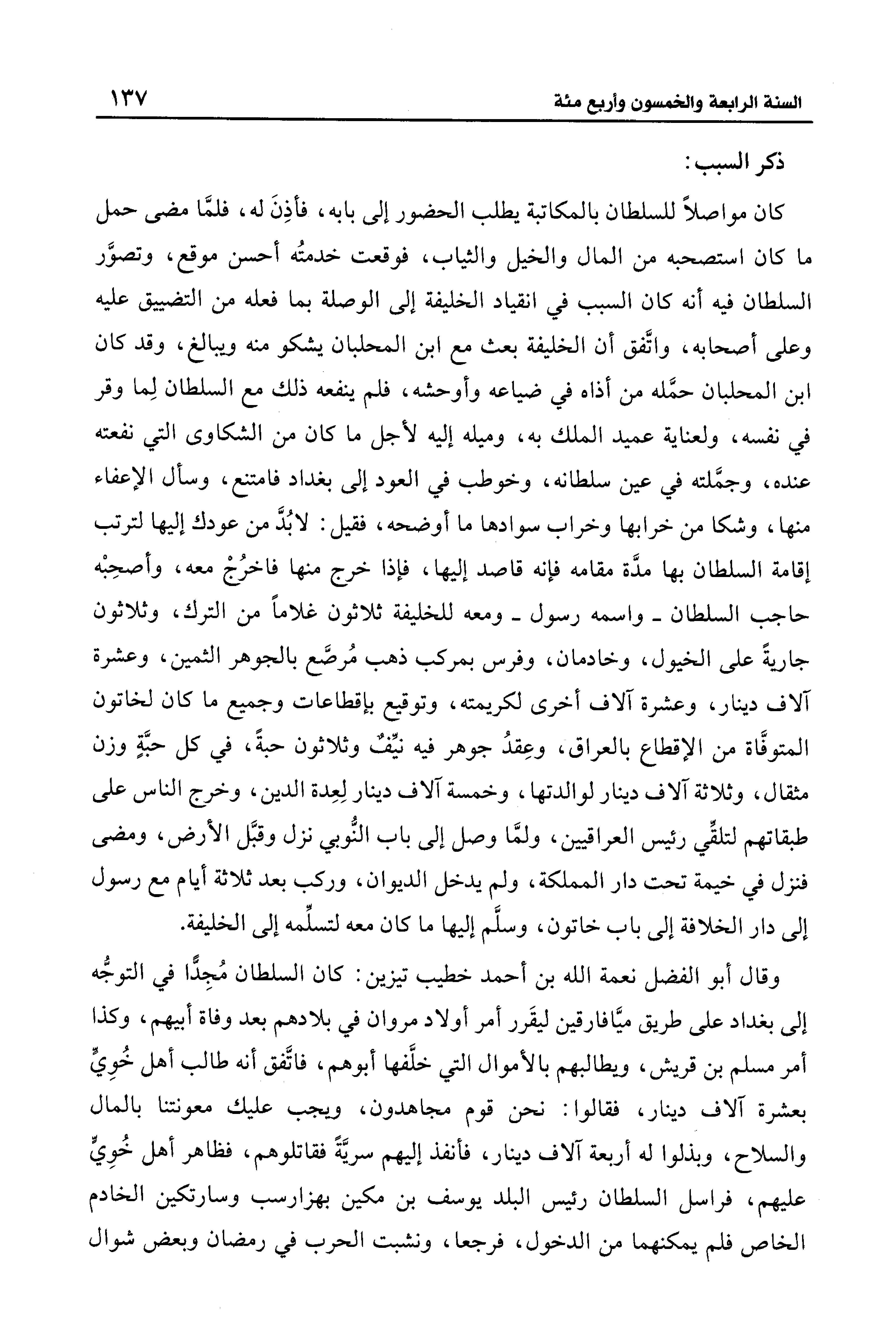 كان مواصلًا للسلطان بالمكاتبة يطلب الحضور إلى بابه، فأذِنَ له، فلمَّا مضى حمل ما كان استصحبه من المال والخيل والثياب، فوقعت خدمتُه أحسن موقع، وتصوَّر السلطان فيه أنه كان السبب في انقياد الخليفة إلى الوصلة بما فعله من التضييق عليه وعلى أصحابه، واتَّفق أن الخليفة بعث مع ابن المحلبان يشكو منه ويبالغ، وقد كان ابن المحلبان حمَّله من أذاه في ضياعه وأوحشه، فلم ينفعه ذلك مع السلطان لِما وقر في نفسه، ولعناية عميد الملك به، وميله إليه لأجل ما كان من الشكاوى التي نفعته عنده، وجمَّلته في عين سلطانه، وخوطب في العود إلى بغداد فامتنع، وسأل الإعفاء منها، وشكا من خرابها وخراب سوادها ما أوضحه، فقيل: لابُدَّ من عودك إليها لترتب إقامة السلطان بها مدَّة مقامه فإنه قاصد إليها، فإذا خرج منها فاخرُجْ معه، وأصحِبْه حاجب السلطان -واسمه رسول- ومعه للخليفة ثلاثون غلامًا من الترك، وثلاثون جاريةً على الخيول، وخادمان، وفرس بمركب ذهب مُرصَّع بالجوهر الثمين، وعشرة آلاف دينار، وعشرة آلاف أخرى لكريمته، وتوقيع بإقطاعات وجميع ما كان لخاتون المتوفَّاة من الإقطاع بالعراق، وعِقدُ جوهر فيه نيِّفٌ وثلاثون حبةً، في كل حبَّةٍ وزن مثقال، وثلاثة آلاف دينار لوالدتها، وخمسة آلاف دينار لِعِدة الدين، وخرج الناس على طبقاتهم لتلقِّي رئيس العراقيين، ولمَّا وصل إلى باب النُّوبي نزل وقبَّل الأرض، ومضى فنزل في خيمة تحت دار المملكة، ولم يدخل الديوان، وركب بعد ثلاثة أيام مع رسول إلى دار الخلافة إلى باب خاتون، وسلَّم إليها ما كان معه لتسلِّمه إلى الخليفة.