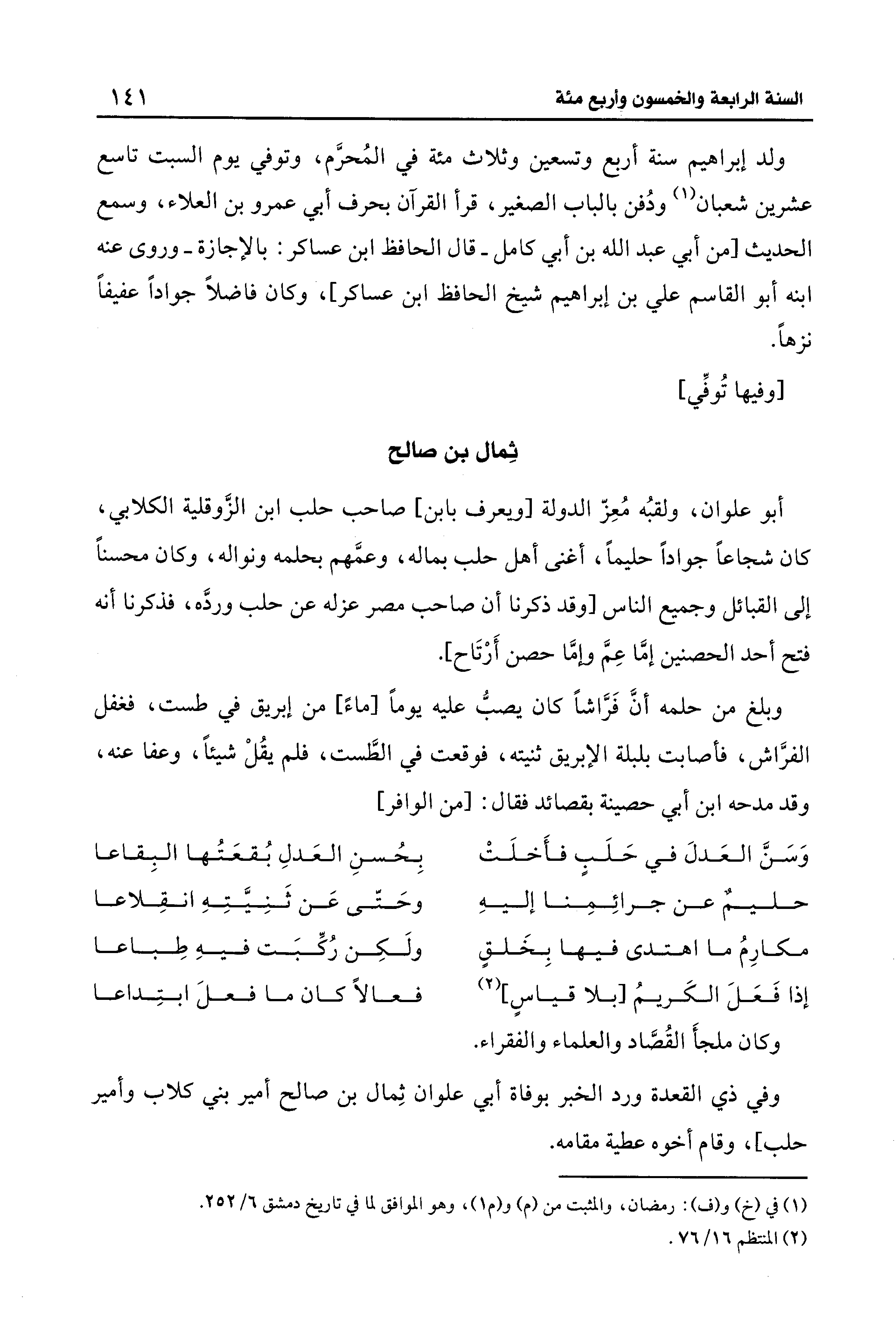 وفي ذي القعدة ورد الخبر بوفاة أبي علوان ثِمال بن صالح أمير بني كلاب وأمير حلب]، وقام أخوه عطية مقامه.