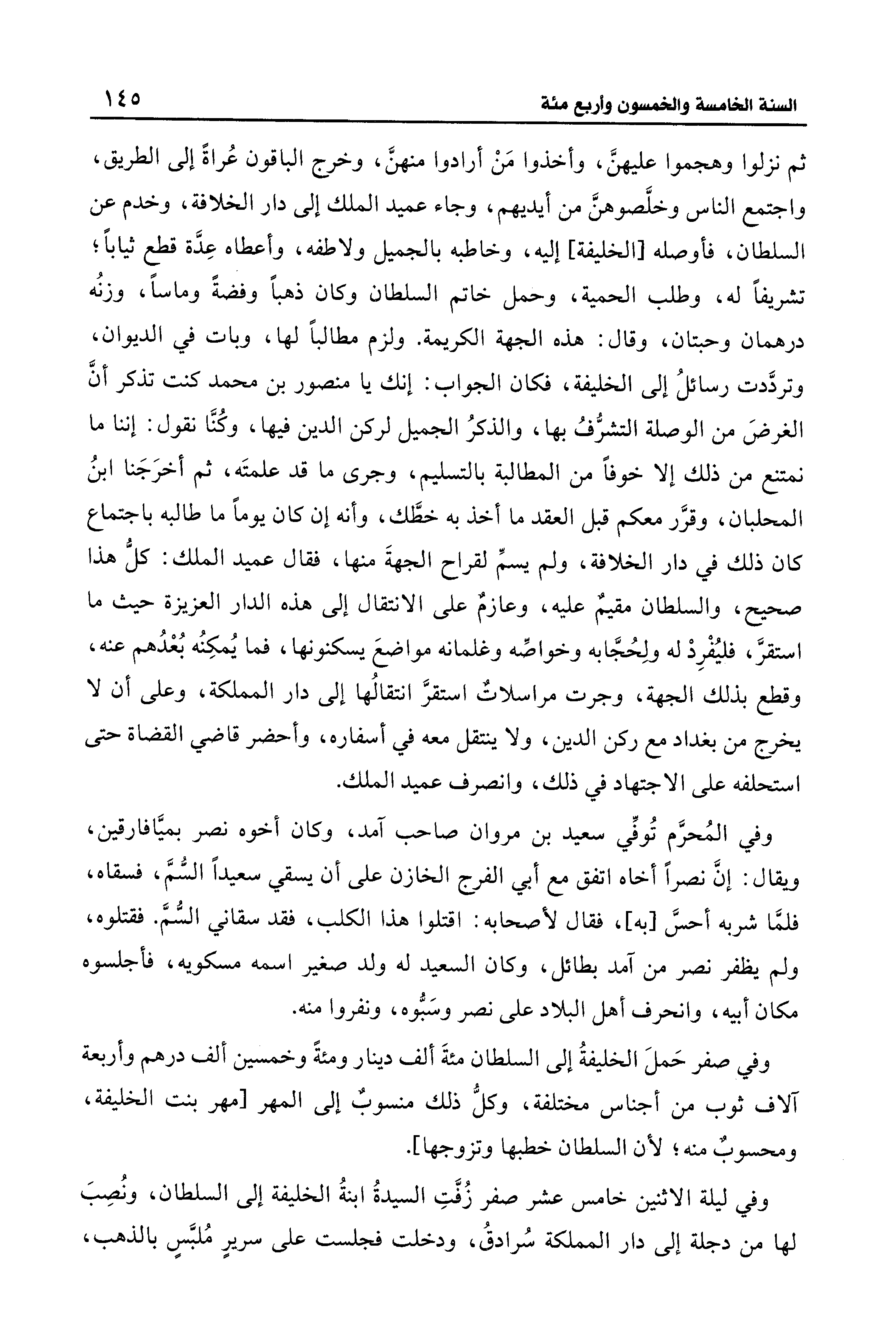 ثم نزلوا وهجموا عليهنَّ، وأخذوا مَنْ أرادوا منهنَّ، وخرج الباقون عُراةً إلى الطريق، واجتمع الناس وخلَّصوهنَّ من أيديهم، وجاء عميد الملك إلى دار الخلافة، وخدم عن السلطان، فأوصله [الخليفة] إليه، وخاطبه بالجميل ولاطفه، وأعطاه عِدَّة قطع ثيابًا؛ تشريفًا له، وطلب الحمية، وحمل خاتم السلطان وكان ذهبًا وفضةً وماسًا، وزنُه درهمان وحبتان، وقال: هذه الجهة الكريمة. ولزم مطالبًا لها، وبات في الديوان، وتردَّدت رسائلُ إلى الخليفة، فكان الجواب: إنك يا منصور بن محمد كنت تذكر أنَّ الغرضَ من الوصلة التشرُّفُ بها، والذكرُ الجميل لركن الدين فيها، وكُنَّا نقول: إننا ما نمتنع من ذلك إلا خوفًا من المطالبة بالتسليم، وجرى ما قد علمتَه، ثم أخرَجَنا ابنُ المحلبان، وقرَّر معكم قبل العقد ما أخذ به خطَّك، وأنه إن كان يومًا ما طالبه باجتماع كان ذلك في دار الخلافة، ولم يسمِّ لقراح الجهةَ منها، فقال عميد الملك: كلُّ هذا صحيح، والسلطان مقيمٌ عليه، وعازمٌ على الانتقال إلى هذه الدار العزيزة حيث ما استقرَّ، فليُفْرِدْ له ولِحُجَّابه وخواصِّه وغلمانه مواضعَ يسكنونها، فما يُمكِنُه بُعْدُهم عنه، وقطع بذلك الجهة، وجرت مراسلاتٌ استقرَّ انتقالُها إلى دار المملكة، وعلى أن لا يخرج من بغداد مع ركن الدين، ولا ينتقل معه في أسفاره، وأحضر قاضي القضاة حتى استحلفه على الاجتهاد في ذلك، وانصرف عميد الملك.