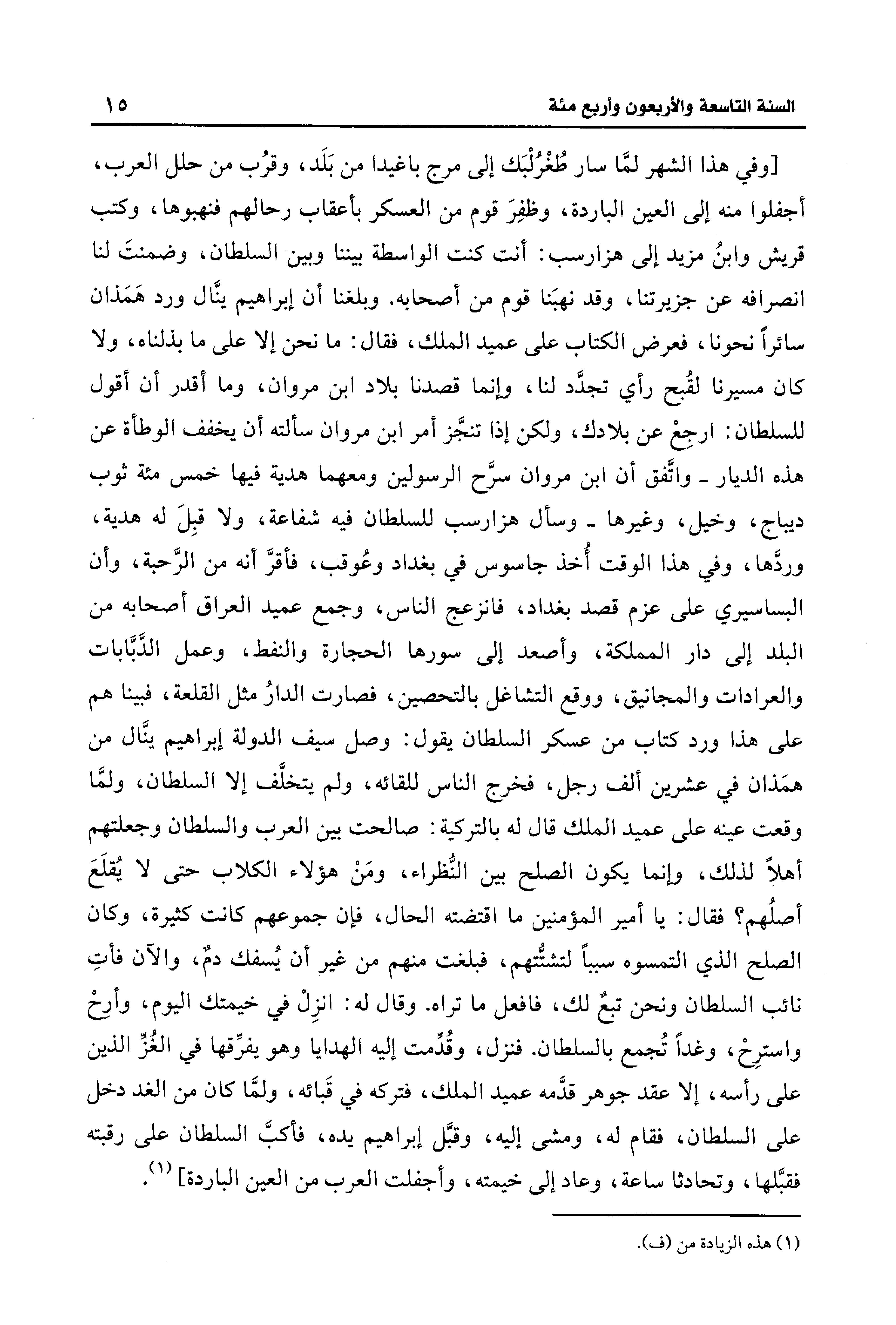 [وفي هذا الشهر لمَّا سار طُغْرُلْبَك إلى مرج باغيدا من بَلَد، وقرُب من حلل العرب، أجفلوا منه إلى العين الباردة، وظفِرَ قوم من العسكر بأعقاب رحالهم فنهبوها، وكتب قريش وابنُ مزيد إلى هزارسب: أَنْتَ كنت الواسطة بيننا وبين السلطان، وضمنتَ لنا انصرافه عن جزيرتنا، وقد نهبَنا قوم من أصحابه. وبلغنا أن إبراهيم ينَّال ورد هَمَذان سائرًا نحونا، فعرض الكتاب على عميد الملك، فقال: ما نحن إلَّا على ما بذلناه، ولا كان مسيرنا لقُبح رأي تجدَّد لنا، وإنما قصدنا بلاد ابن مروان، وما أقدر أن أقول للسلطان: ارجِعْ عن بلادك، ولكن إذا تنجَّز أمر ابن مروان سألته أن يخفف الوطأة عن هذه الديار -واتَّفق أن ابن مروان سرَّح الرسولين ومعهما هدية فيها خمس مئة ثوب ديباج، وخيل، وغيرها- وسأل هزارسب للسلطان فيه شفاعة، ولا قبِلَ له هدية، وردَّها، وفي هذا الوقت أُخذ جاسوس في بغداد وعُوقب، فأقرَّ أنَّه من الرَّحبة، وأن البساسيري على عزم قصد بغداد، فانزعج النَّاس، وجمع عميد العراق أصحابه من البلد إلى دار المملكة، وأصعد إلى سورها الحجارة والنفط، وعمل الدَّبَّابات والعرادات والمجانيق، ووقع التشاغل بالتحصين، فصارت الدارُ مثل القلعة، فبينا هم على هذا ورد كتاب من عسكر السلطان يقول: وصل سيف الدولة إبراهيم ينَّال من همَذان في عشرين أَلْف رجل، فخرج النَّاس للقائه، ولم يتخلَّف إلَّا السلطان، ولمَّا وقعت عينه على عميد الملك قال له بالتركية: صالحت بين العرب والسلطان وجعلتهم أهلًا لذلك، وإنما يكون الصلح بين النُّظراء، ومَنْ هؤلاء الكلاب حتَّى لا يُقلَعَ أصلُهم؟ فقال: يَا أمير المُؤْمنين ما اقتضته الحال، فإن جموعهم كانت كثيرة، وكان الصلح الذي التمسوه سببًا لتشتُّتهم، فبلغت منهم من غير أن يُسفك دمٌ، والآن فأتِ نائب السلطان ونحن تبعٌ لك، فافعل ما تراه. وقال له: انزِلْ في خيمتك اليوم، وأرحْ واسترِحْ، وغدًا تُجمع بالسلطان. فنزل، وقُدِّمت إليه الهدايا وهو يفرِّقها في الغُزِّ الذين على رأسه، إلَّا عقد جوهر قدَّمه عميد الملك، فتركه في قَبائه، ولمَّا كان من الغد دخل على السلطان، فقام له، ومشى إليه، وقبَّل إبراهيم يده، فأكبَّ السلطان على رقبته فقبَّلها، وتحادثا ساعة، وعاد إلى خيمته، وأجفلت العرب من العين الباردة] (¬1).