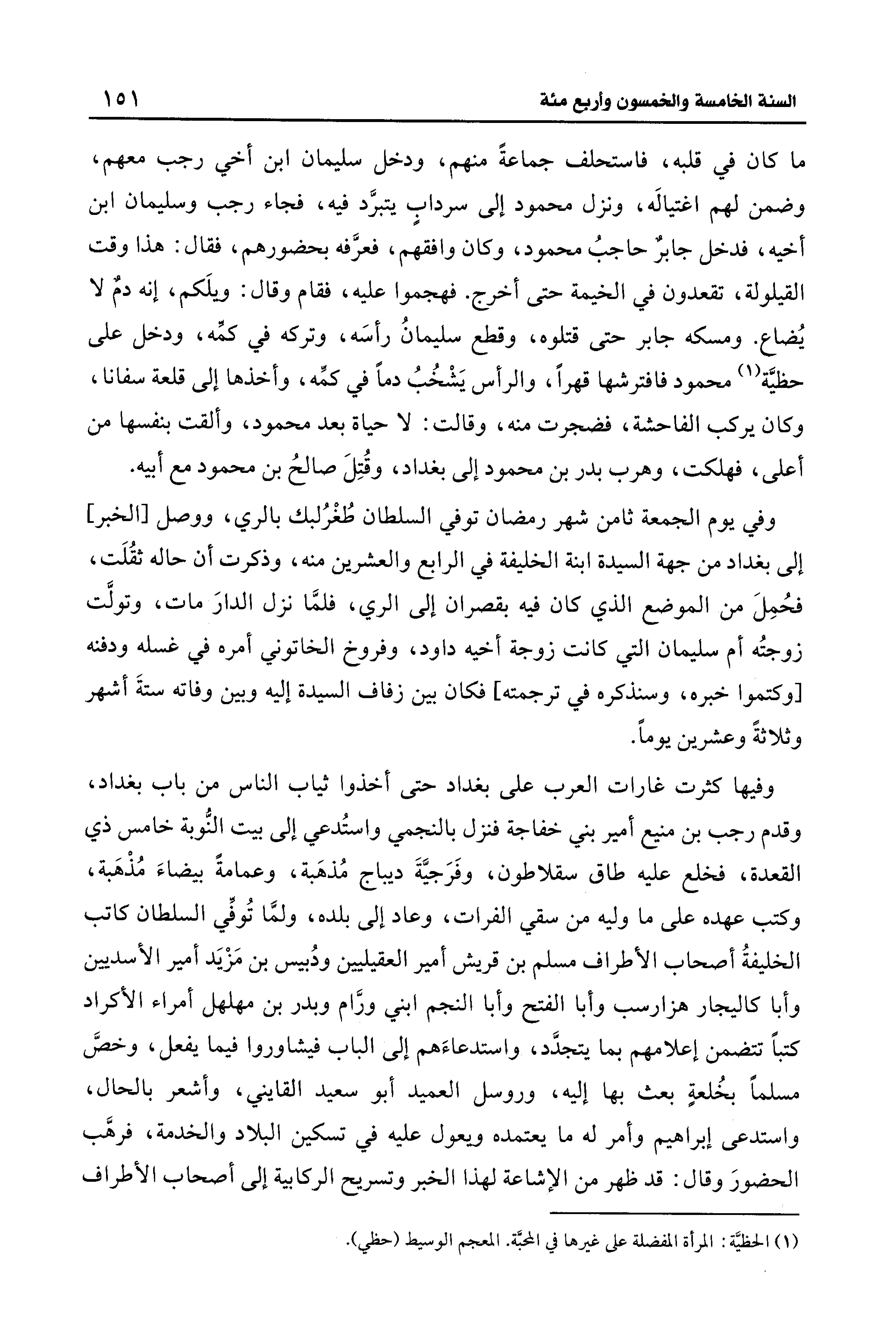 ما كان في قلبه، فاستحلف جماعةً منهم، ودخل سليمان ابن أخي رجب معهم، وضمن لهم اغتيالَه، ونزل محمود إلى سردابٍ يتبرَّد فيه، فجاء رجب وسليمان ابن أخيه، فدخل جابرٌ حاجبُ محمود، وكان وافقهم، فعرَّفه بحضورهم، فقال: هذا وقت القيلولة، تقعدون في الخيمة حتى أخرج. فهجموا عليه، فقام وقال: ويلَكم، إنه دمٌ لا يُضاع. ومسكه جابر حتى قتلوه، وقطع سليمانُ رأسَه، وتركه في كمِّه، ودخل على حظيَّة (¬1) محمود فافترشها قهرًا، والرأس يَشْخُبُ دمًا في كمِّه، وأخذها إلى قلعة سفانا، وكان يركب الفاحشة، فضجرت منه، وقالت: لا حياة بعد محمود، وألقت بنفسها من أعلى، فهلكت، وهرب بدر بن محمود إلى بغداد، وقُتِلَ صالحُ بن محمود مع أبيه.