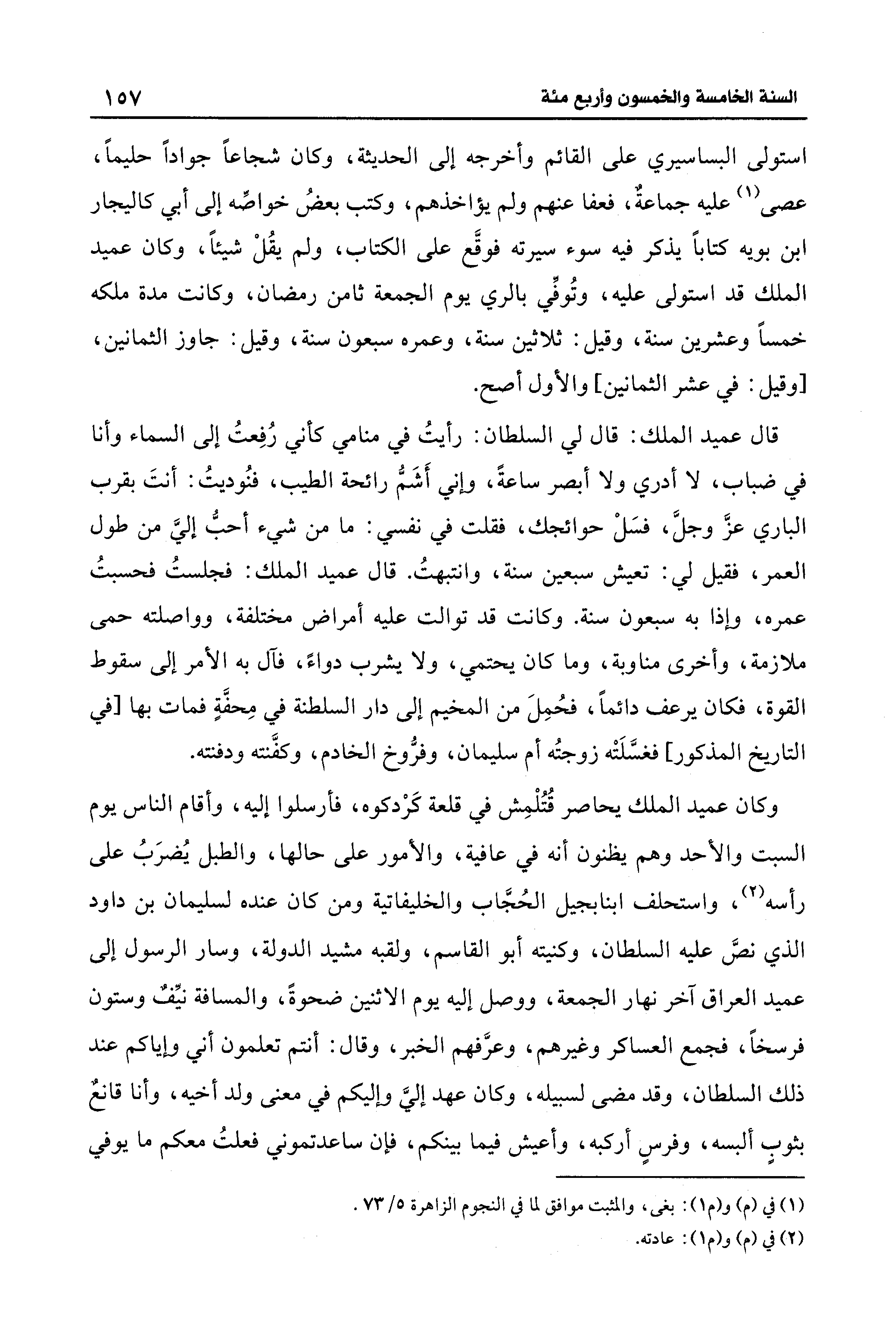 استولى البساسيري على القائم وأخرجه إلى الحديثة، وكان شجاعًا جوادًا حليمًا، عصى (¬1) عليه جماعةٌ، فعفا عنهم ولم يؤاخذهم، وكتب بعضُ خواصِّه إلى أبي كاليجار بن بويه كتابًا يذكر فيه سوء سيرته فوقَّع على الكتاب، ولم يقُلْ شيئًا، وكان عميد الملك قد استولى عليه، وتُوفِّي بالري يوم الجمعة ثامن رمضان، وكانت مدة ملكه خمسًا وعشرين سنة، وقيل: ثلاثين سنة، وعمره سبعون سنة، وقيل: جاوز الثمانين، [وقيل: في عشر الثمانين] والأول أصح.