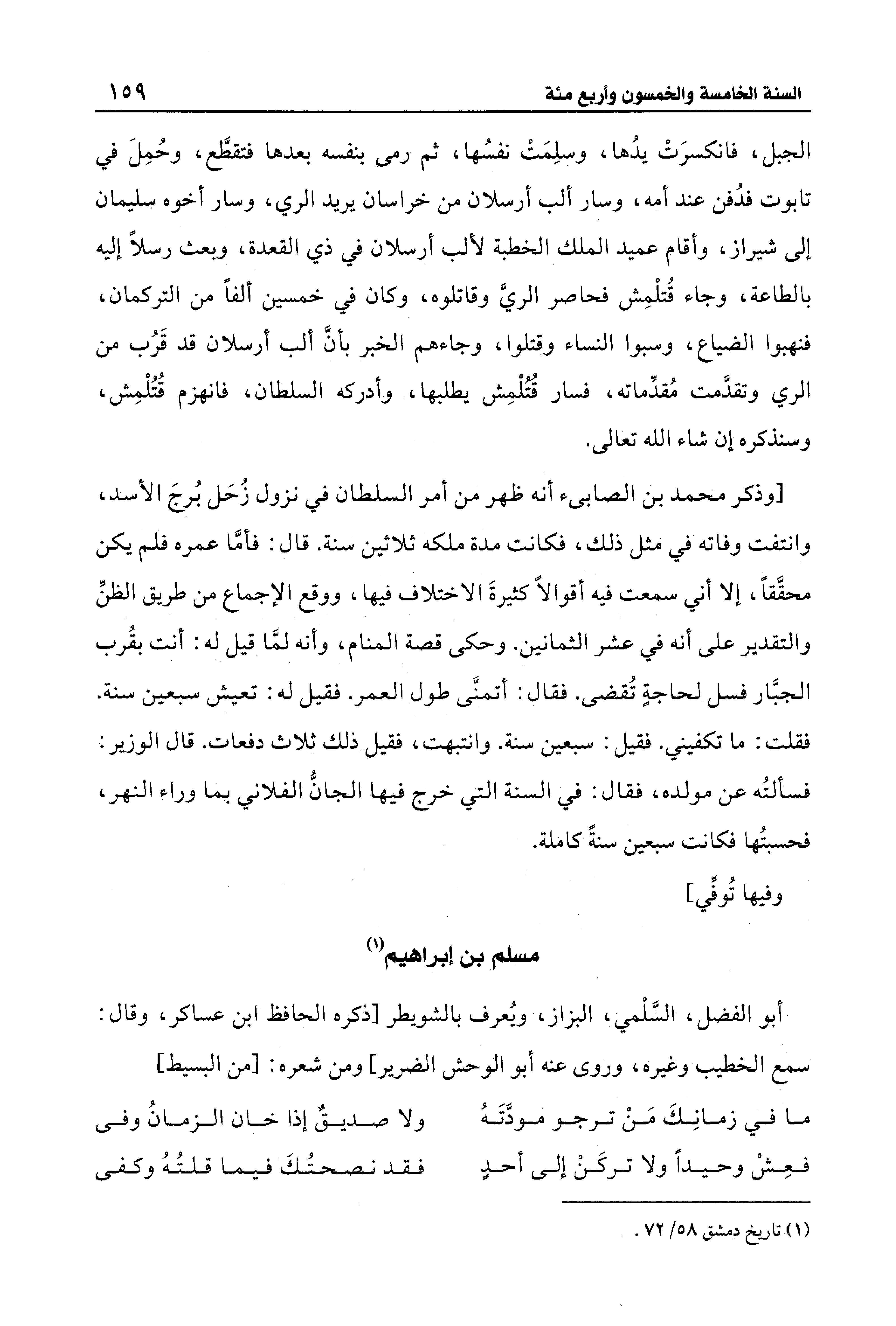 الجبل، فانكسرَتْ يدُها، وسلِمَتْ نفسُها، ثم رمى بنفسه بعدها فتقطَّع، وحُمِلَ في تابوت فدُفن عند أمه، وسار ألب أرسلان من خراسان يريد الري، وسار أخوه سليمان إلى شيراز، وأقام عميد الملك الخطبة لألب أرسلان في ذي القعدة، وبعث رسلًا إليه بالطاعة، وجاء قُتلْمِش فحاصر الريَّ وقاتلوه، وكان في خمسين ألفًا من التركمان، فنهبوا الضياع، وسبوا النساء وقتلوا، وجاءهم الخبر بأنَّ ألب أرسلان قد قَرُب من الري وتقدَّمت مُقدِّماته، فسار قُتُلْمِش يطلبها، وأدركه السلطان، فانهزم قُتُلْمِش، وسنذكره إن شاء الله تعالى.