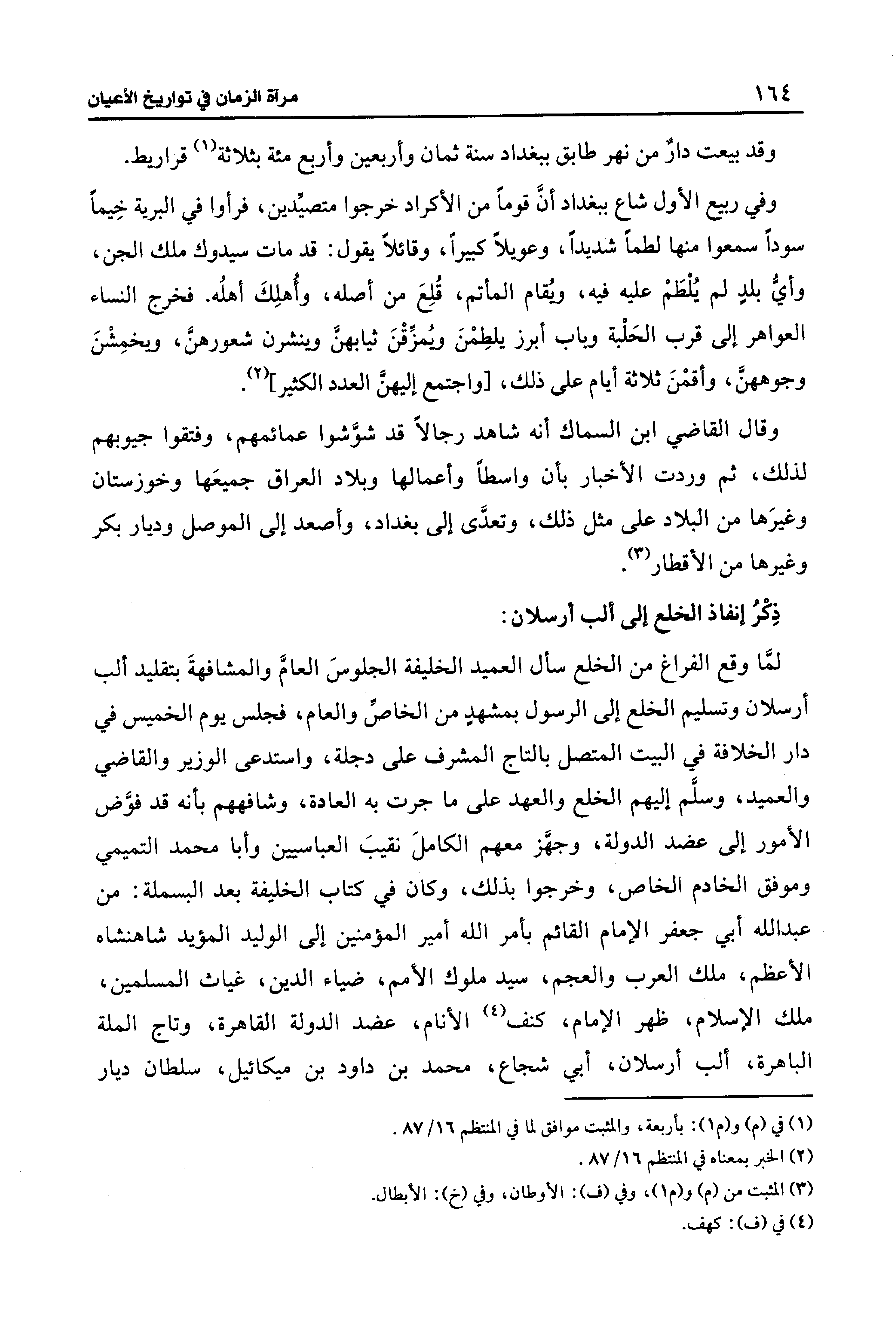 لمَّا وقع الفراغ من الخلع سأل العميد الخليفة الجلوسَ العامَّ والمشافهةَ بتقليد ألب أرسلان وتسليم الخلع إلى الرسول بمشهدٍ من الخاصِّ والعام، فجلس يوم الخميس في دار الخلافة في البيت المتصل بالتاج المشرف على دجلة، واستدعى الوزير والقاضي والعميد، وسلَّم إليهم الخلع والعهد على ما جرت به العادة، وشافههم بأنه قد فوَّض الأمور إلى عضد الدولة، وجهَّز معهم الكاملَ نقيبَ العباسيين وأبا محمد التميمي وموفق الخادم الخاص، وخرجوا بذلك، وكان في كتاب الخليفة بعد البسملة: من عبد الله أبي جعفر الإمام القائم بأمر الله أمير المؤمنين إلى الوليد المؤيد شاهنشاه الأعظم، ملك العرب والعجم، سيد ملوك الأمم، ضياء الدين، غياث المسلمين، ملك الإسلام، ظهر الإمام، كنف (¬4) الأنام، عضد الدولة القاهرة، وتاج الملة الباهرة، ألب أرسلان، أبي شجاع، محمد بن داود بن ميكائيل، سلطان ديار