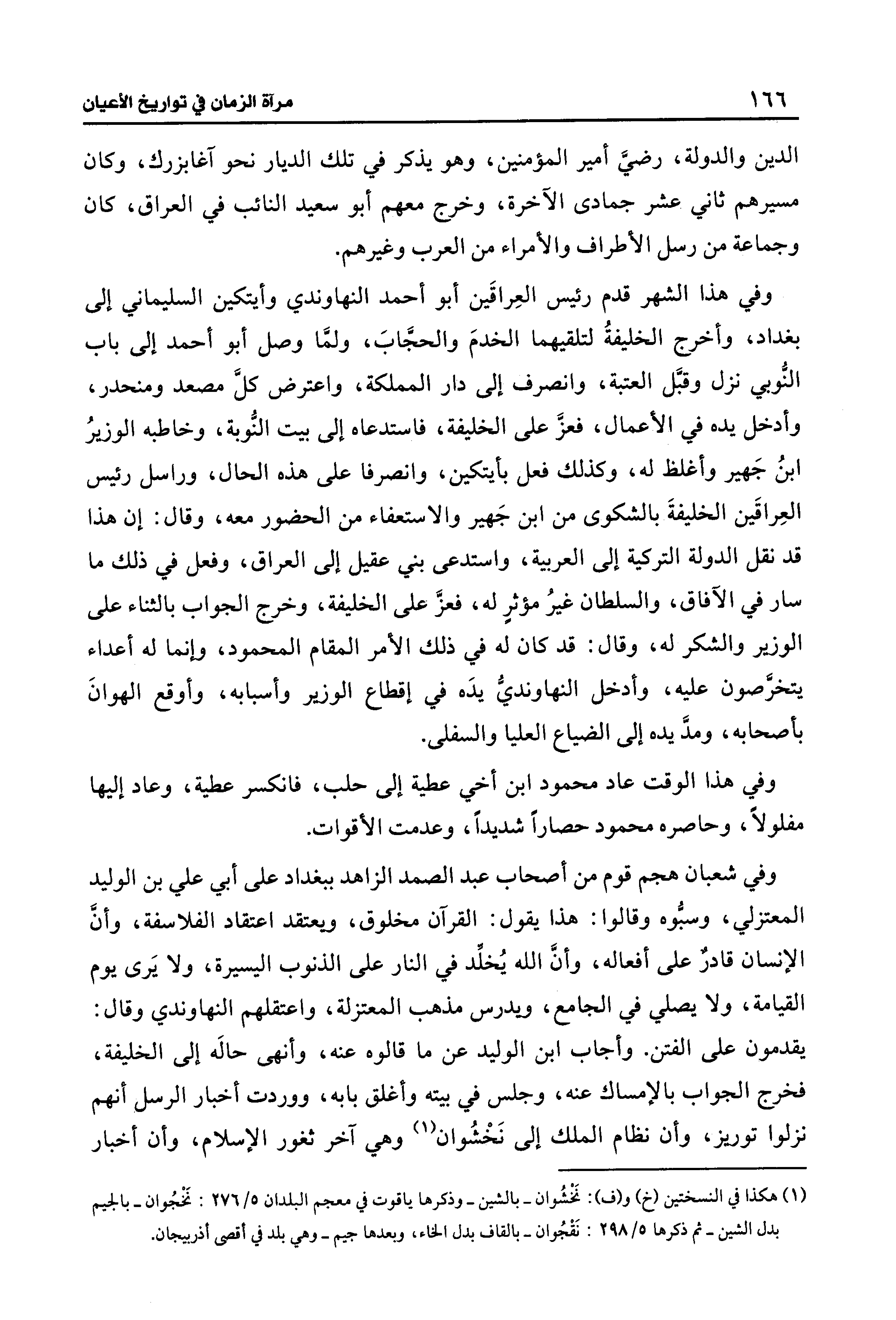 وفي شعبان هجم قوم من أصحاب عبد الصمد الزاهد ببغداد على أبي علي بن الوليد المعتزلي، وسبُّوه وقالوا: هذا يقول: القرآن مخلوق، ويعتقد اعتقاد الفلاسفة، وأنَّ الإنسان قادرٌ على أفعاله، وأنَّ الله يُخلِّد في النار على الذنوب اليسيرة، ولا يَرى يوم القيامة، ولا يصلي في الجامع، ويدرس مذهب المعتزلة، واعتقلهم النهاوندي وقال: يقدمون على الفتن. وأجاب ابن الوليد عن ما قالوه عنه، وأنهى حاله إلى الخليفة، فخرج الجواب بالإمساك عنه، وجلس في بيته وأغلق بابه، ووردت أخبار الرسل أنهم نزلوا توريز، وأن نظام الملك إلى نَخْشُوان (¬1) وهي آخر ثغور الإسلام، وأن أخبار