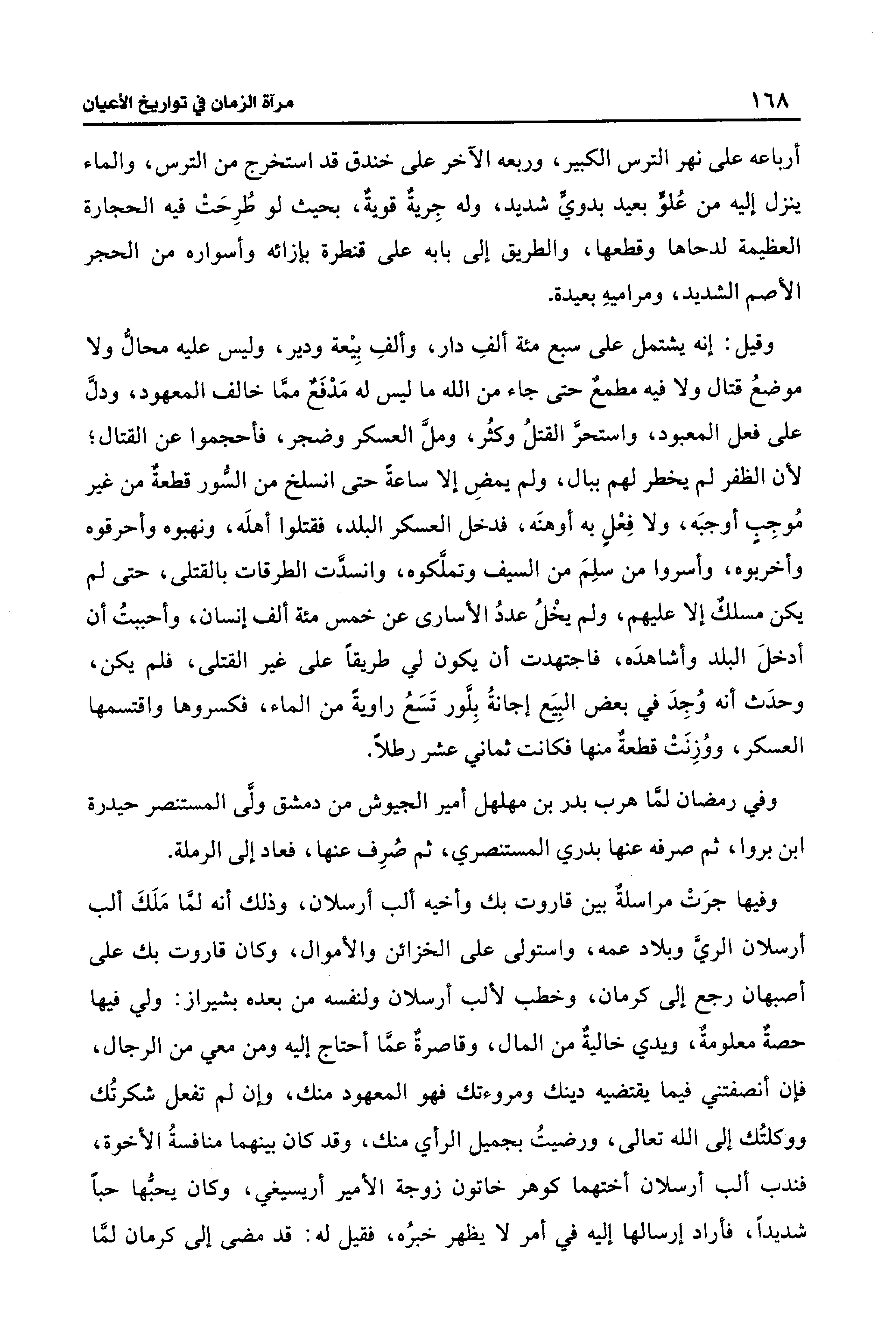 وفيها جرَتْ مراسلةٌ بين قاروت بك وأخيه ألب أرسلان، وذلك أنه لمَّا مَلَكَ ألب أرسلان الريَّ وبلاد عمه، واستولى على الخزائن والأموال، وكان قاروت بك على أصبهان رجع إلى كرمان، وخطب لألب أرسلان ولنفسه من بعده بشيراز: ولي فيها حصةٌ معلومةٌ، ويدي خاليةٌ من المال، وقاصرةٌ عمَّا أحتاج إليه ومن معي من الرجال، فإن أنصفتني فيما يقتضيه دينك ومروءتك فهو المعهود منك، وإن لم تفعل شكرتُك ووكلتُك إلى الله تعالى، ورضيتُ بجميل الرأي منك، وقد كان بينهما منافسةُ الأخوة، فندب ألب أرسلان أختهما كوهر خاتون زوجة الأمير أريسيغي، وكان يحبُّها حبًّا شديدًا، فأراد إرسالها إليه في أمر لا يظهر خبرُه، فقيل له: قد مضى إلى كرمان لمَّا