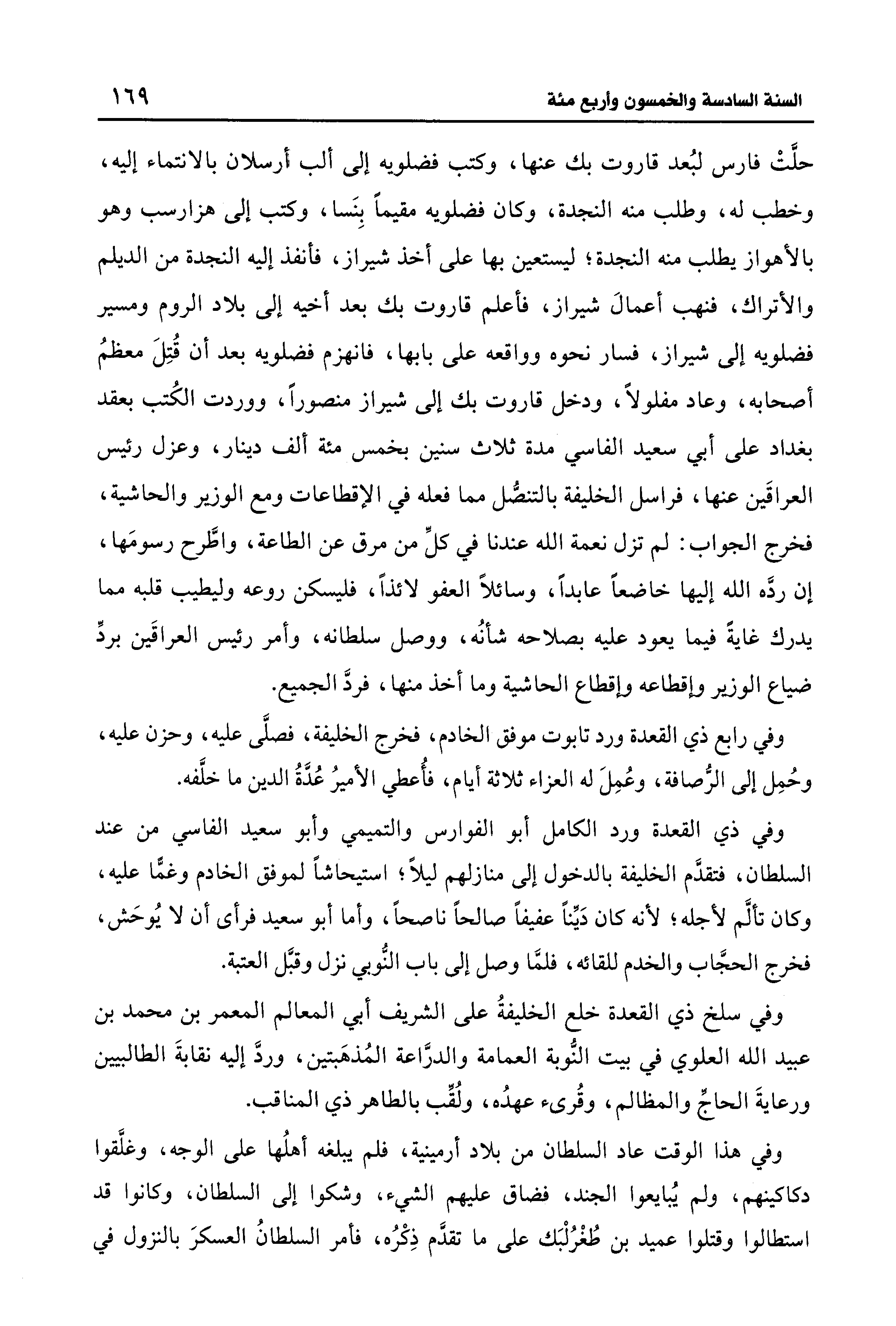 حلَّتْ فارس لبُعد قاروت بك عنها، وكتب فضلويه إلى ألب أرسلان بالانتماء إليه، وخطب له، وطلب منه النجدة، وكان فضلويه مقيمًا بِنَسا، وكتب إلى هزارسب وهو بالأهواز يطلب منه النجدة؛ ليستعين بها على أخذ شيراز، فأنفذ إليه النجدة من الديلم والأتراك، فنهب أعمال شيراز، فأعلم قاروت بك بعد أخيه إلى بلاد الروم ومسير فضلويه إلى شيراز، فسار نحوه وواقعه على بابها، فانهزم فضلويه بعد أن قُتِلَ معظمُ أصحابه، وعاد مفلولًا، ودخل قاروت بك إلى شيراز منصورًا، ووردت الكُتب بعقد بغداد على أبي سعيد الفاسي مدة ثلاث سنين بخمس مئة ألف دينار، وعزل رئيس العراقَين عنها، فراسل الخليفة بالتنصُّل مما فعله في الإقطاعات ومع الوزير والحاشية، فخرج الجواب: لم تزل نعمة الله عندنا في كلِّ من مرق عن الطاعة، واطَّرح رسومَها، إن ردَّه الله إليها خاضعًا عابدًا، وسائلًا العفو لائذًا، فليسكن روعه وليطيب قلبه مما يدرك غايةً فيما يعود عليه بصلاحه شأنُه، ووصل سلطانه، وأمر رئيس العراقَين بردِّ ضياع الوزير وإقطاعه وإقطاع الحاشية وما أخذ منها، فردَّ الجميع.