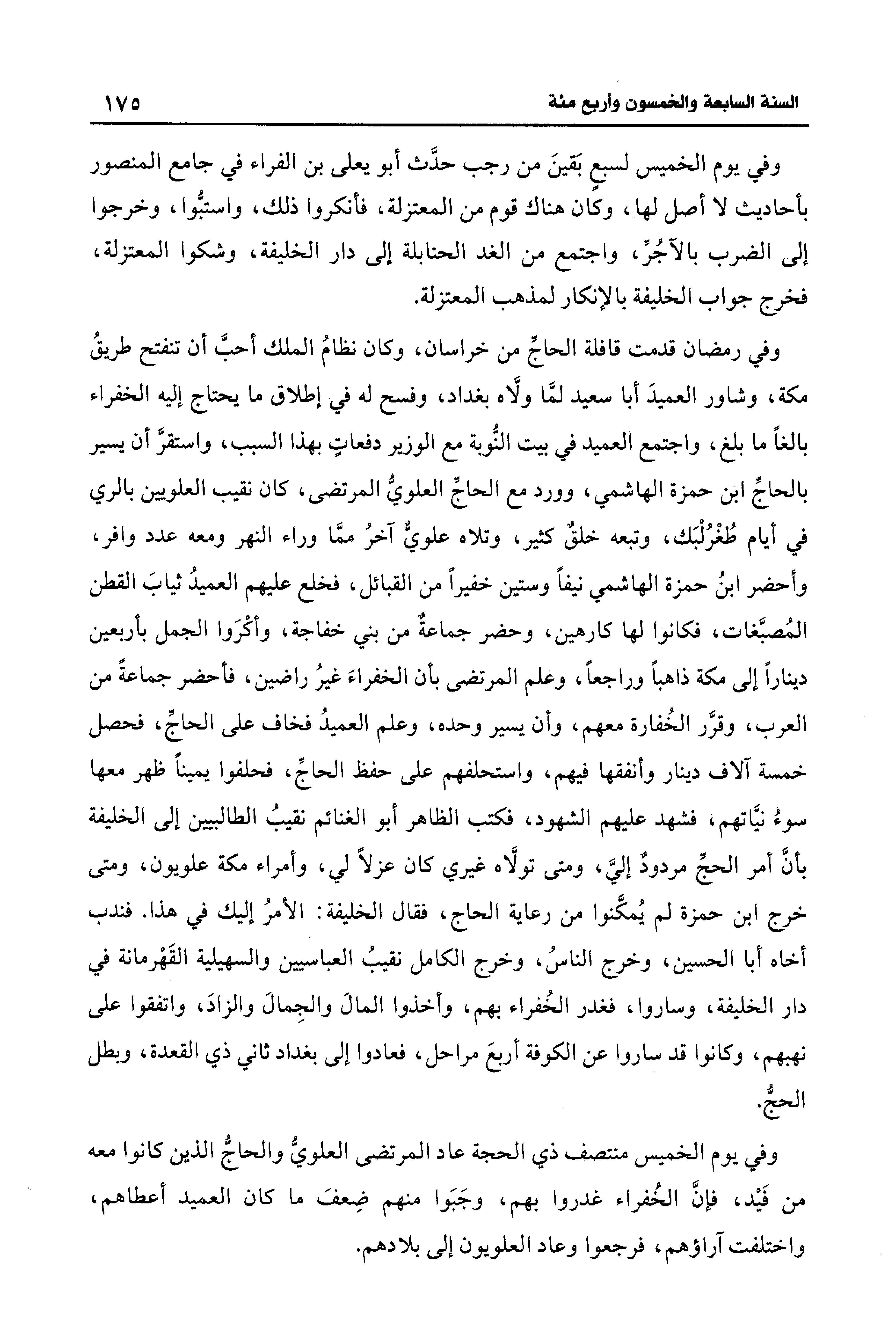 وفي رمضان قدمت قافلة الحاجِّ من خراسان، وكان نظامُ الملك أحبَّ أن تنفتح طريقُ مكة، وشاور العميدَ أبا سعيد لمَّا ولَّاه بغداد، وفسح له في إطلاق ما يحتاج إليه الخفراء بالغًا ما بلغ، واجتمع العميد في بيت النُّوبة مع الوزير دفعاتٍ بهذا السبب، واستقرَّ أن يسير بالحاجِّ ابن حمزة الهاشمي، وورد مع الحاجِّ العلويُّ المرتضى، كان نقيب العلويين بالري في أيام طُغْرُلْبَك، وتبعه خلقٌ كثير، وتلاه علويٌّ آخرُ ممَّا وراء النهر ومعه عدد وافر، وأحضر ابنُ حمزة الهاشمي نيفًا وستين خفيرًا من القبائل، فخلع عليهم العميدُ ثيابَ القطن المُصبَّغات، فكانوا لها كارهين، وحضر جماعةٌ من بني خفاجة، وأكْرَوا الجمل بأربعين دينارًا إلى مكة ذاهبًا وراجعًا، وعلم المرتضى بأن الخفراءَ غيرُ راضين، فأحضر جماعةً من العرب، وقرَّر الخُفارة معهم، وأن يسير وحده، وعلم العميدُ فخاف على الحاجِّ، فحصل خمسة آلاف دينار وأنفقها فيهم، واستحلفهم على حفظ الحاجِّ، فحلفوا يمينًا ظهر معها سوءُ نيَّاتهم، فشهد عليهم الشهود، فكتب الظاهر أبو الغنائم نقيبُ الطالبيين إلى الخليفة بأنَّ أمر الحجِّ مردودٌ إليَّ، ومتى تولَّاه غيري كان عزلًا لي، وأمراء مكة علويون، ومتى خرج ابن حمزة لم يُمكَّنوا من رعاية الحاج، فقال الخليفة: الأمرُ إليك في هذا. فندب أخاه أبا الحسين، وخرج الناسُ، وخرج الكامل نقيبُ العباسيين والسهيلية القَهْرمانة في دار الخليفة، وساروا، فغدر الخُفراء بهم، وأخذوا المال والجِمال والزادَ، واتفقوا على نهبهم، وكانوا قد ساروا عن الكوفة أربعَ مراحل، فعادوا إلى بغداد ثاني ذي القعدة، وبطل الحجُّ.